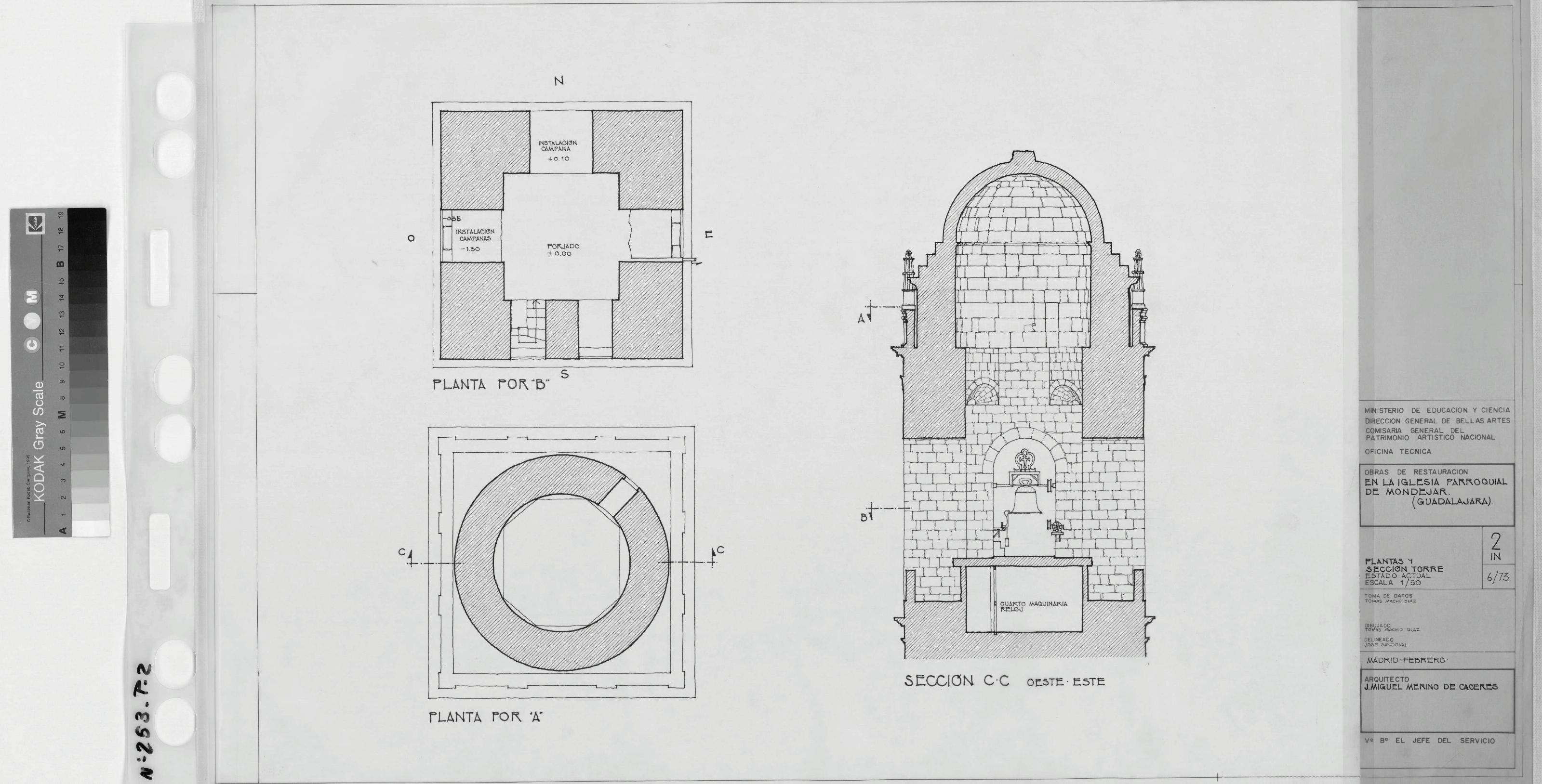 IGLESIA PARROQUIAL DE MONDEJAR - GUADALAJARA-: PLANTAS Y SECCION TORRE, Estado actual , plano dibujado con detalle, en el plano de planta tiene alguna cota de altura, y en la seccion por la torre se ve la sala de maquinaria del reloj, plano sin cotas