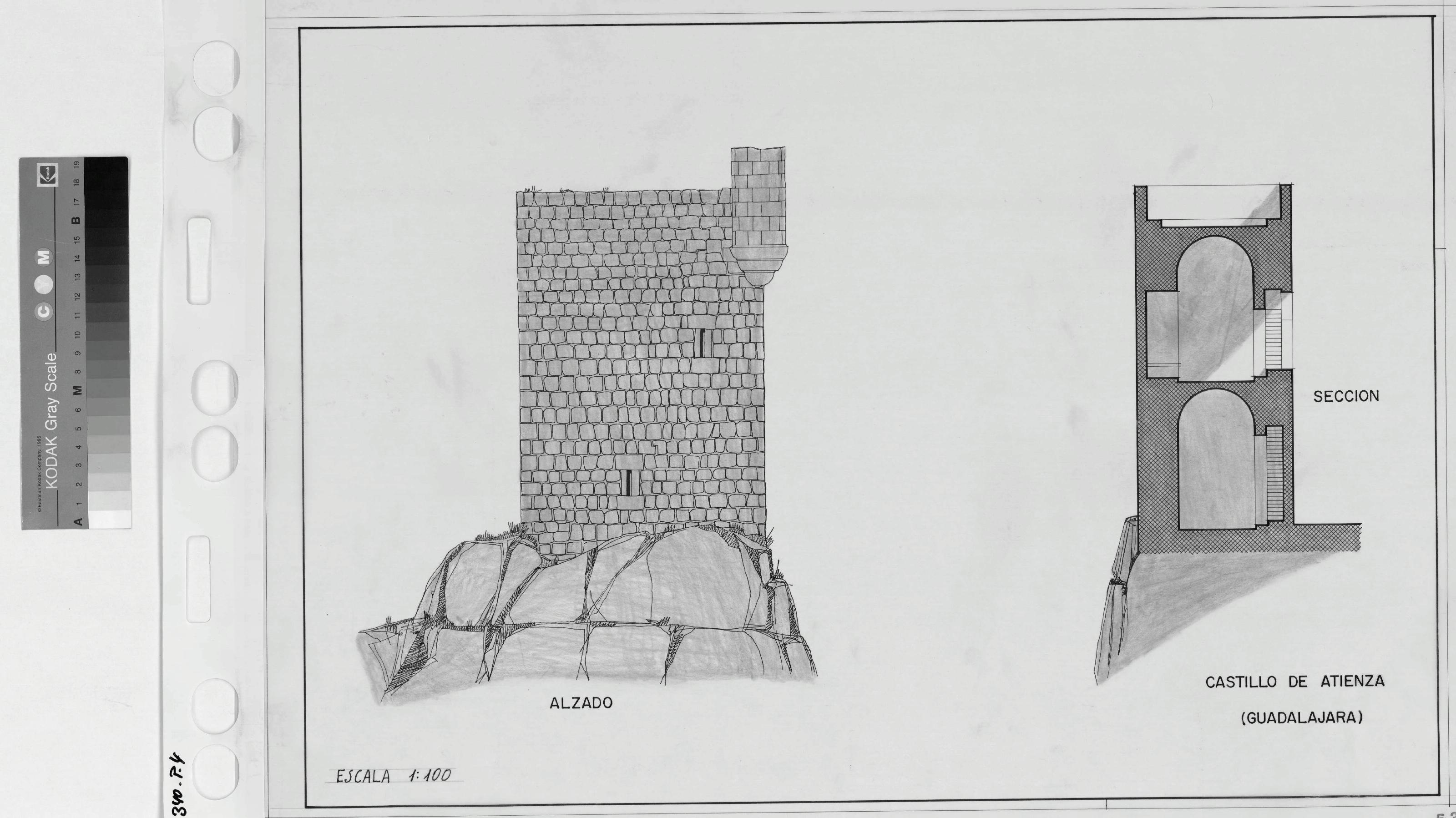 CASTILLO DE ATIENZA - GUADALAJARA-: ALZADO Y SECCION, Alzado de la torre con despiece de piedras, La seccion, marca los muros regruesados y rayados, plano sin cotas.