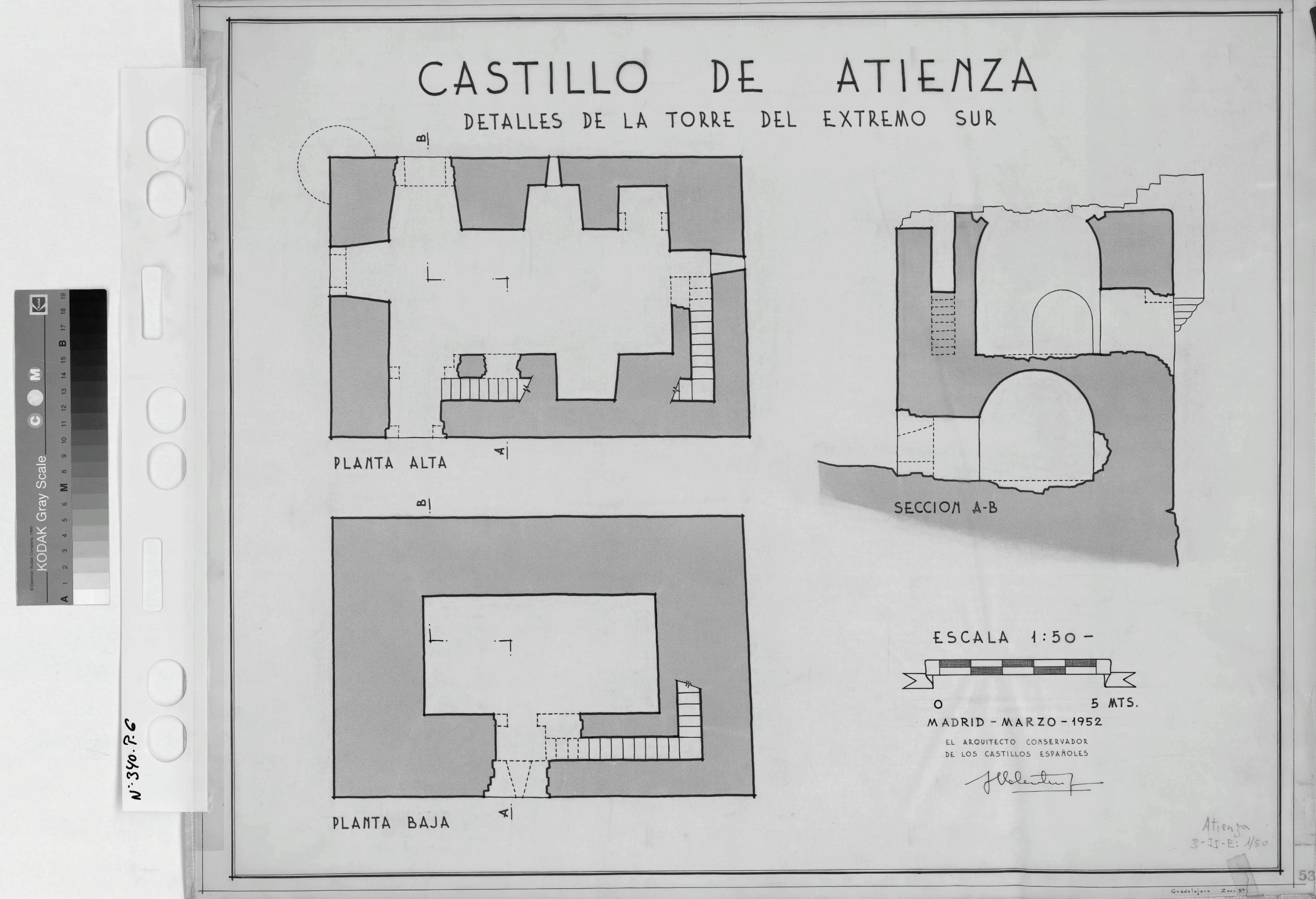 CASTILLO DE ATIENZA - GUADALAJARA-: DETALLES DE LA TORRE DEL EXTREMO SUR. Plantas baja, alta y seccion A-B. Plano donde marca el acceso con muros regruesados y sombreados, plano sin cotas.