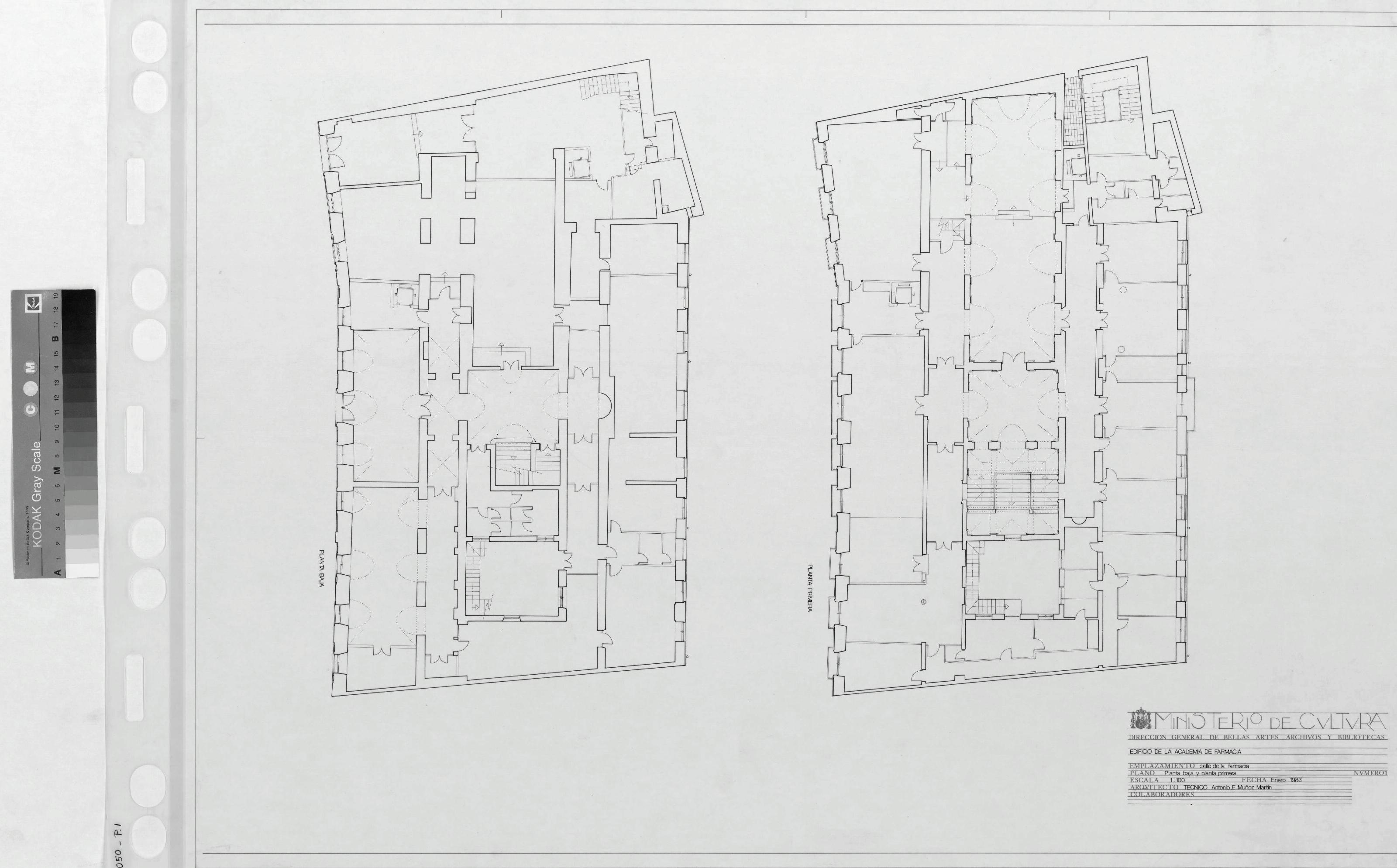 ACADEMIA DE FARMACIA EDIFICIO.: PLANTA BAJA Y PLANTA PRIMERA Plano con planta baja y planta primera , muros regruesados y tabiquerias, con emplazamiento a calle de la farmacia, plano sin cotas.