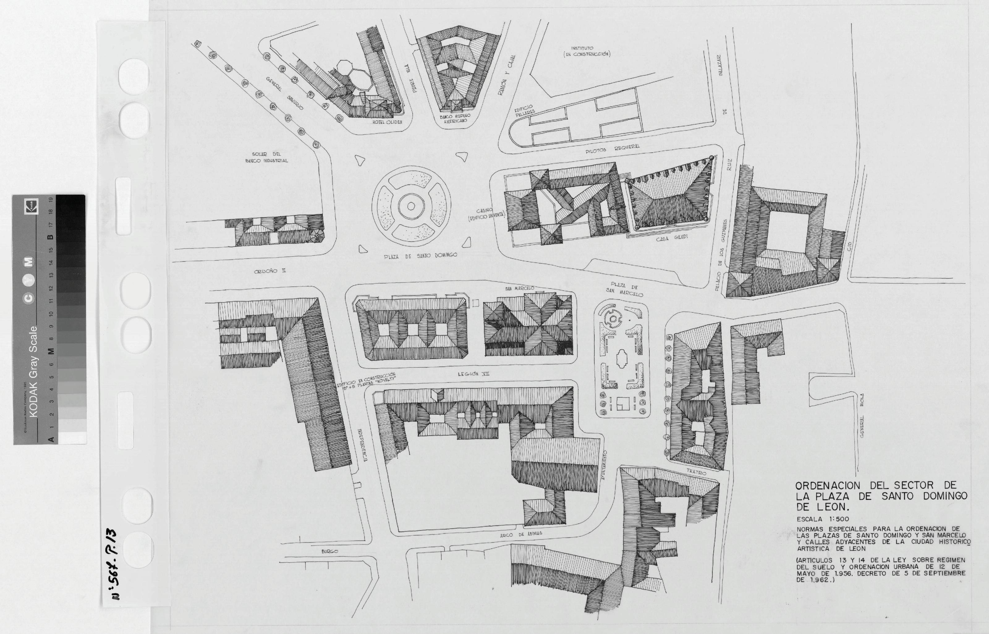 CONJUNTO HISTORICO ARTISTICO DE LEON (León): ORDENACION DEL SECTOR DE LA PLAZA DE SANTO DOMINGO Aparecen las plazas de Santo Domingo y San Marcelo y calles adyacentes con sus nombres, también aparecen dibujados los tejados de los edificios con rallados de diferentes tramados. Se alude en el sello a normativas y artículos que regulan esta ordenación. Sin firmar