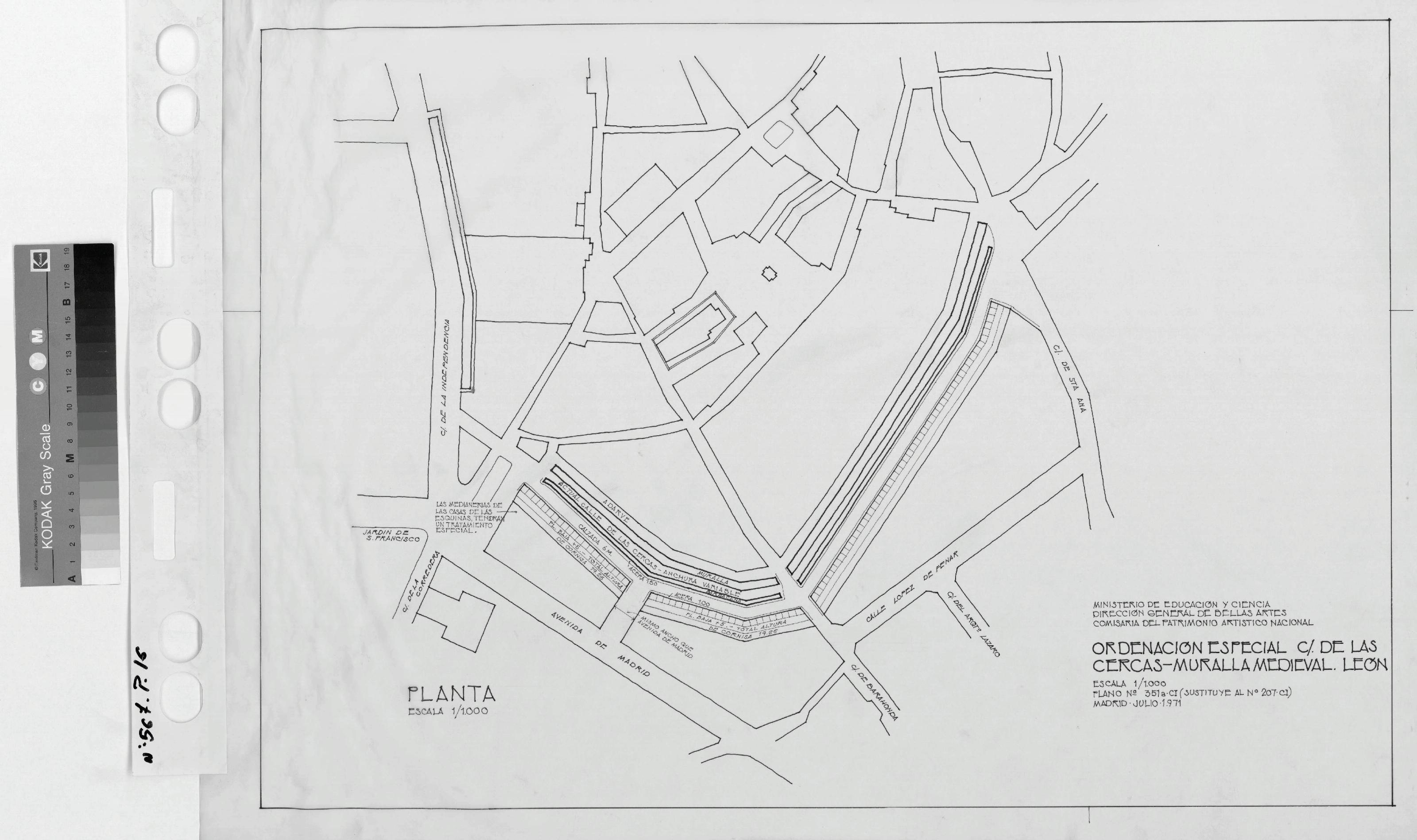 CONJUNTO HISTORICO ARTISTICO DE LEON (León): ORDENACIÓN ESPECIAL C/ DE LAS CERCAS - MURALLA MEDIEVAL Con cotas y notas sobre alineaciones y tratamiento de fachadas. Pone en sello "Plano nº 351a-CI. Sin firmar