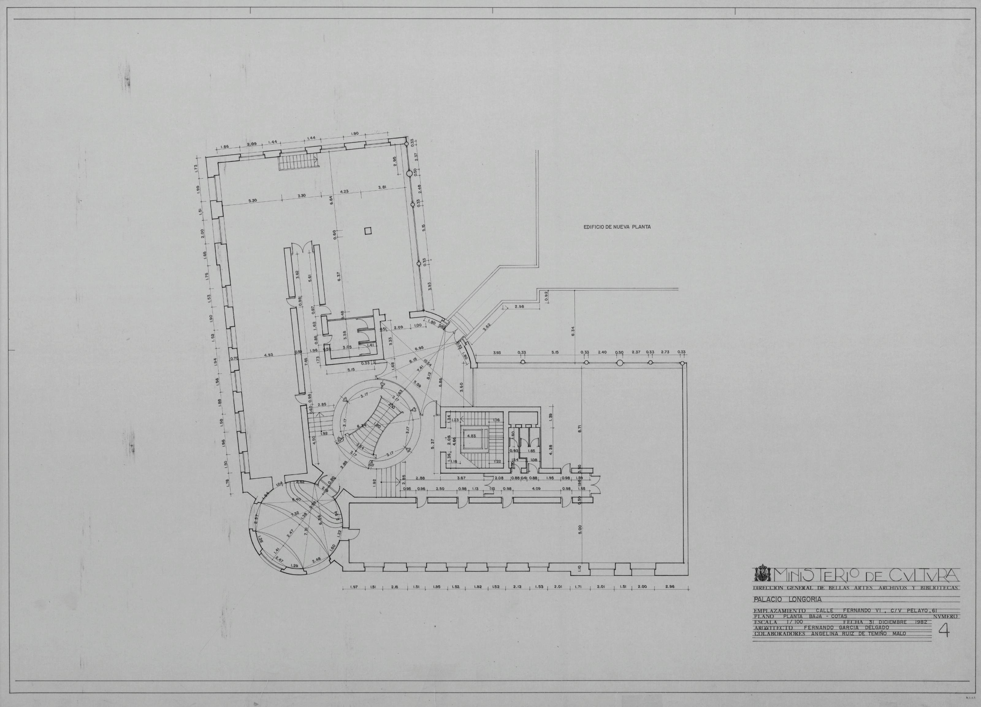 PALACIO DE LONGORIA: PLANTA BAJA COTAS. Planta baja, muros regruesados y tabiquerias, con emplazamiento a calle Fernando VI y calle pelayo ,plano con cotas.