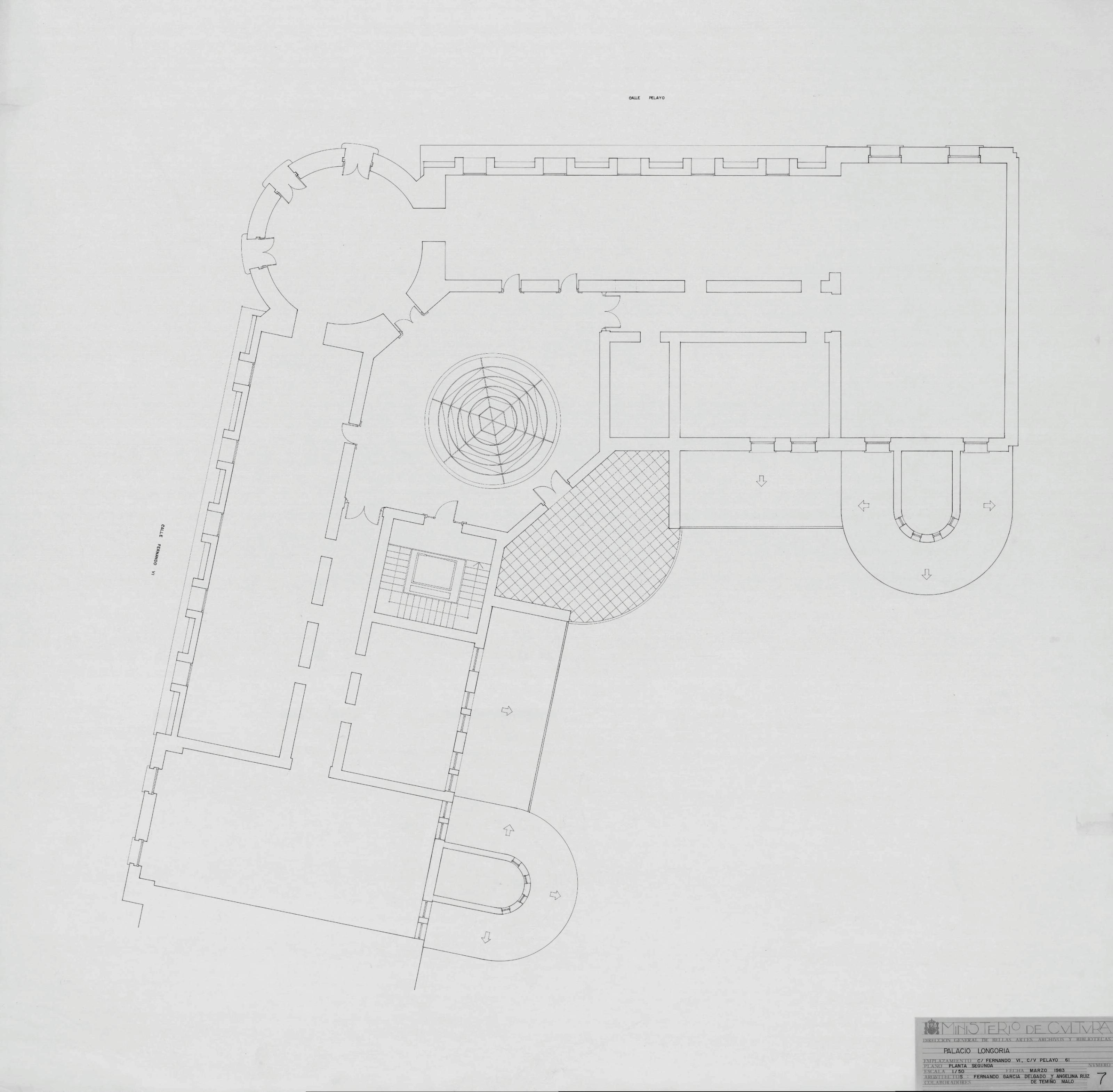 PALACIO DE LONGORIA: PLANTA SEGUNDA . Planta , muros regruesados y tabiquerias, con emplazamiento a calle Fernando VI y calle pelayo ,plano sin cotas.