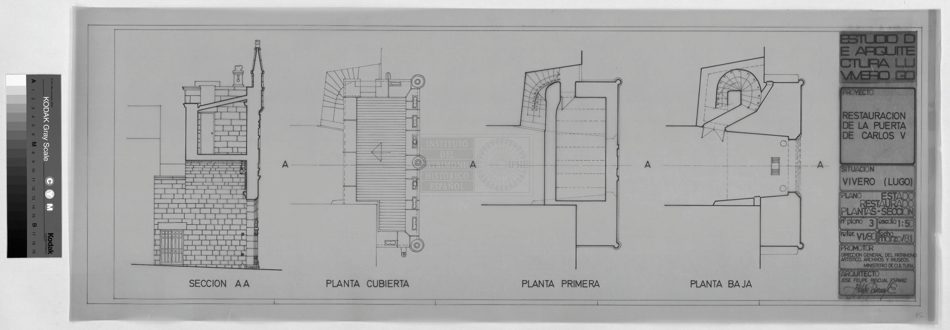 PUERTA CALOS V: PLANTAS: BAJA, PRIMERA, CUBIERTA, SECCION A-B