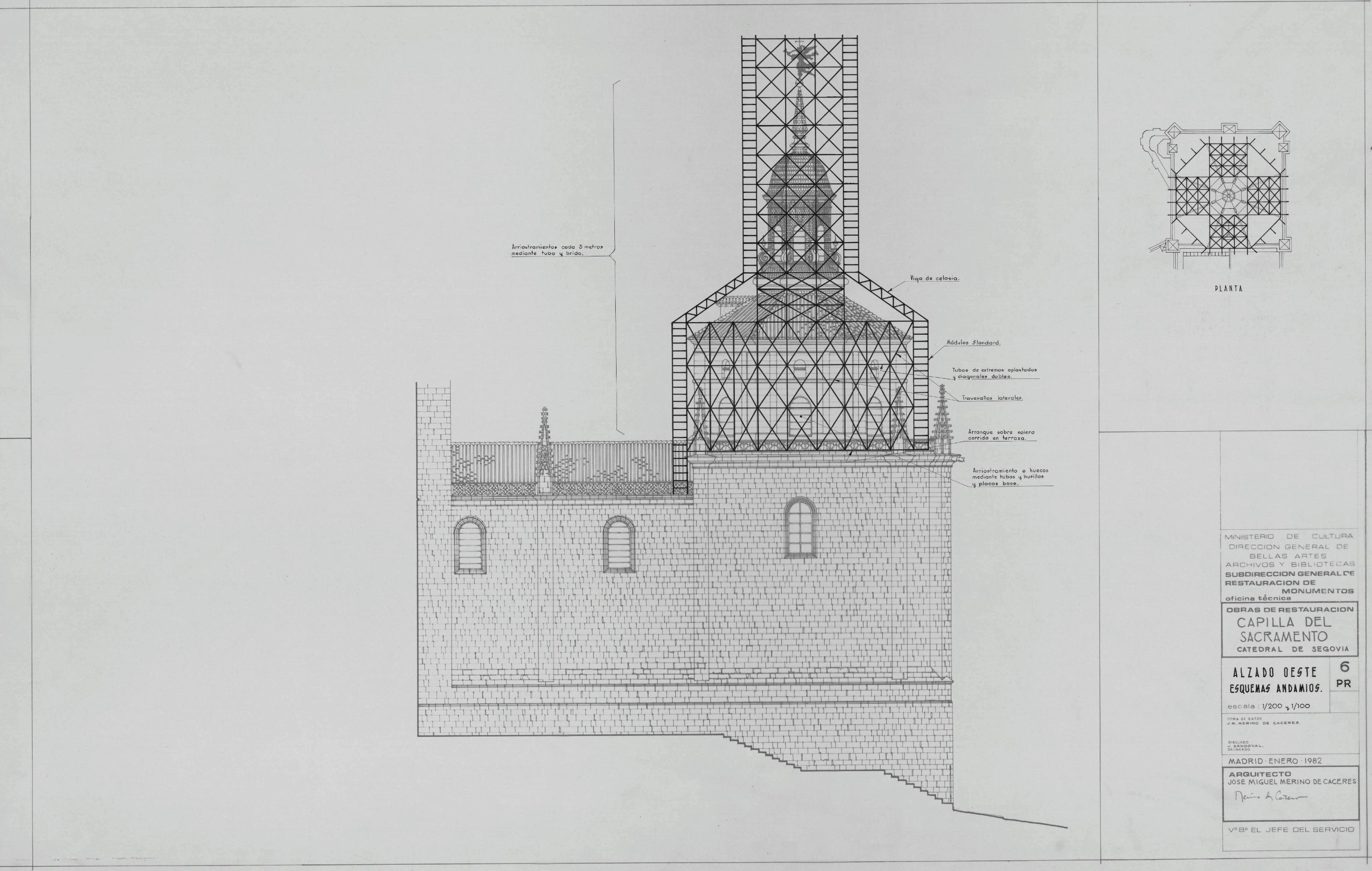CATEDRAL DE SEGOVIA Y CAPILLA DEL SACRAMENTO: ALZADO OESTE -ESQUEMAS DE ANDAMIOS