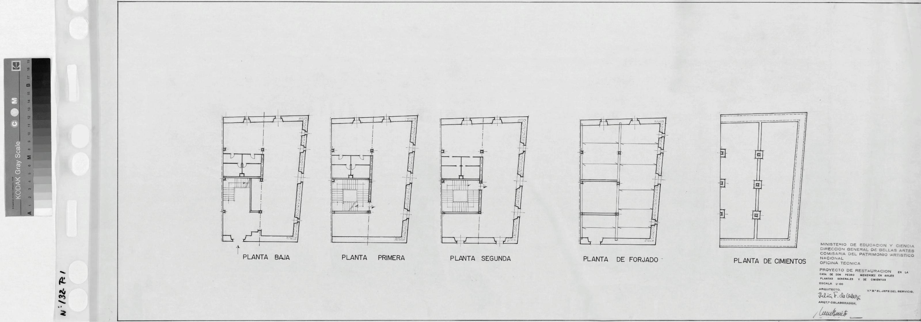 CASA DE DON PEDRO MENENDEZ:.-PROYECTO DE RESTAURACION: PLANTAS:.-PLANTA DE CIMIENTOS.- PLANTA DE FORJADOS.- PLANTA BAJA.- PLANTA PRIMERA.- PLANTA SEGUNDA. PLANTAS CON REPRESENTACION DE ZONAS AFECTADAS POR LA RESTAURACION. PLANTAS SIN COTAS NI MENCIONA USOS.