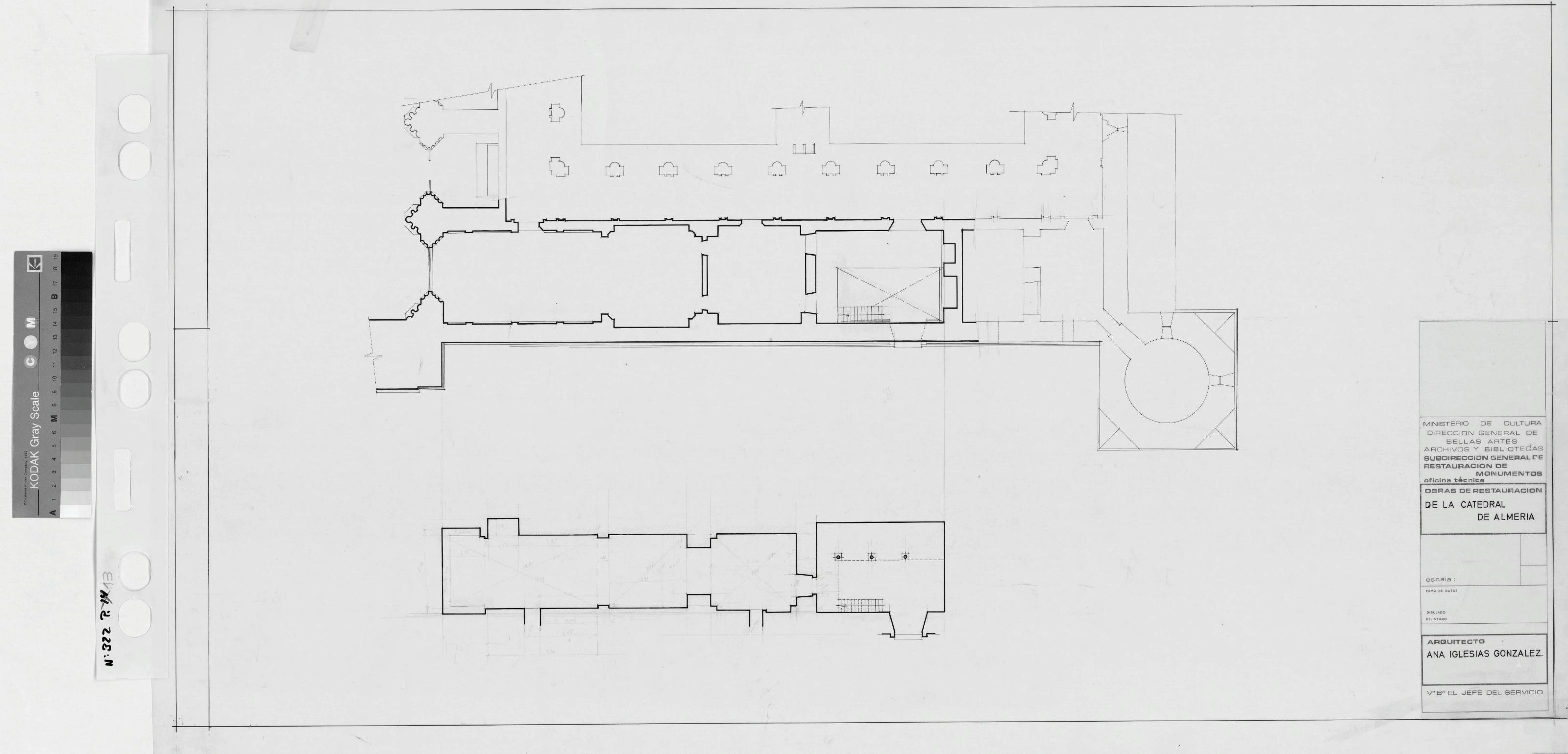 OBRAS DE RESTAURACION EN LA CATEDRAL DE ALMERIA: PLANTA (Un fragmento) en dos niveles Sin notas, Sin cotas, sello sin datos No parece un plano de proyecto