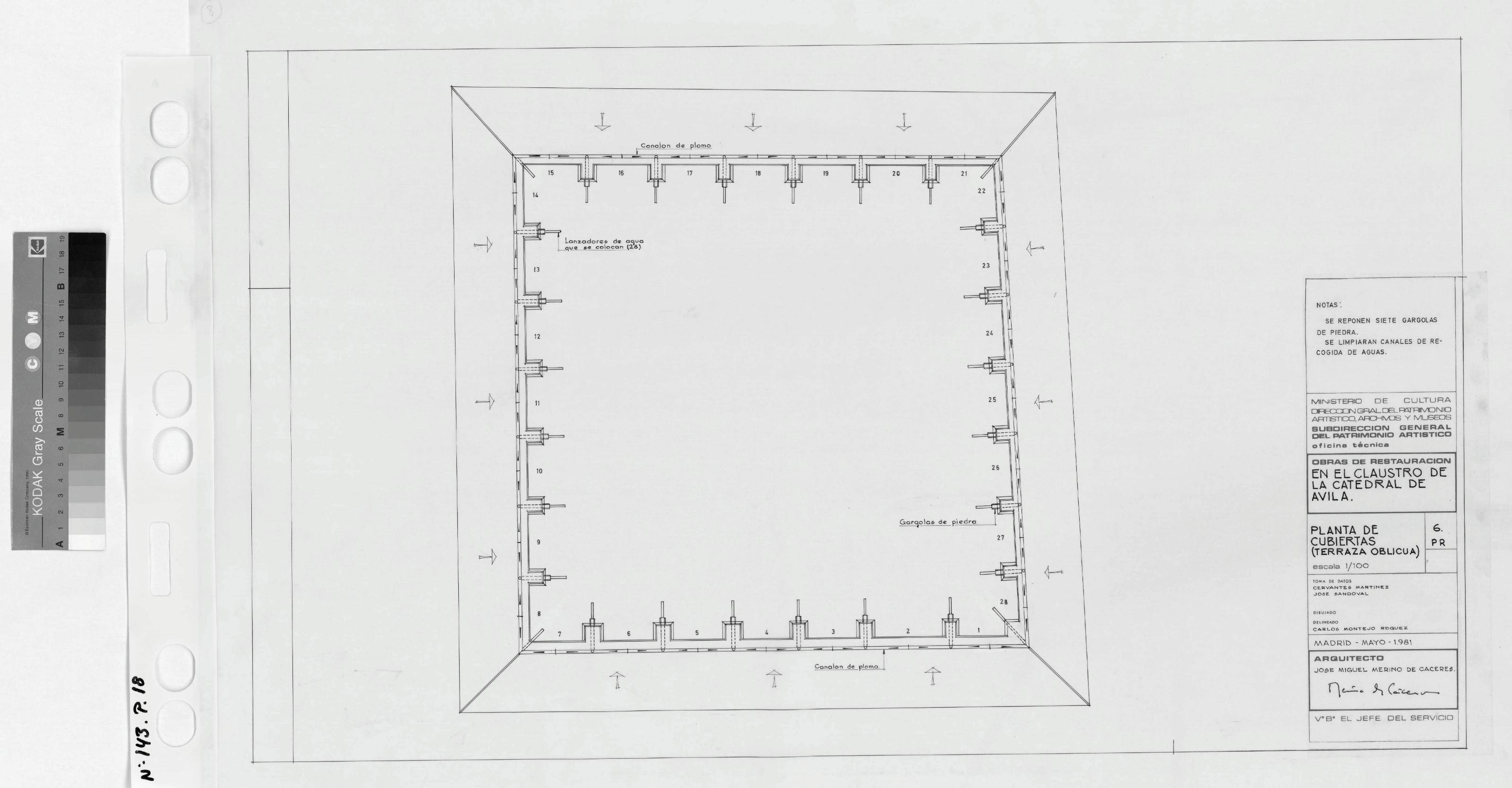 LA CATEDRAL DE AVILA OBRAS EN EL CLAUSTRO: PLANTA DE CUBIERTAS ( TERRAZA OBLICUA ) REPOSICION DE GARGOLAS EN PIEDRA Y LIMPIEZA DE CANALES.