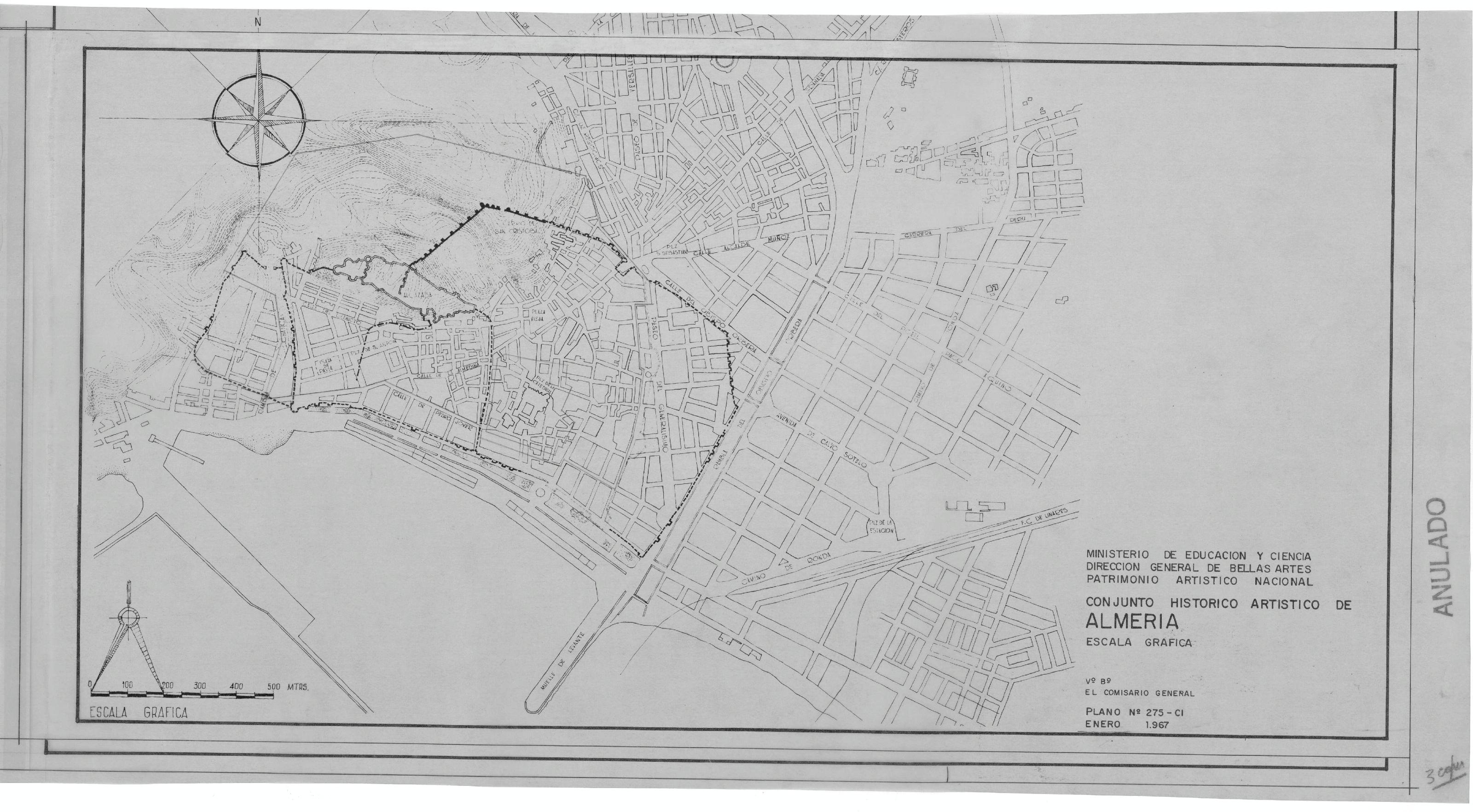 CONJUNTO HISTORICO ARTISTICO DE ALMERIA: PLANO GENERAL Con delimitaciones posiblemente dibujado sobre parcelario nº 275-CI - Enero 1967 Con sello de ANULADO