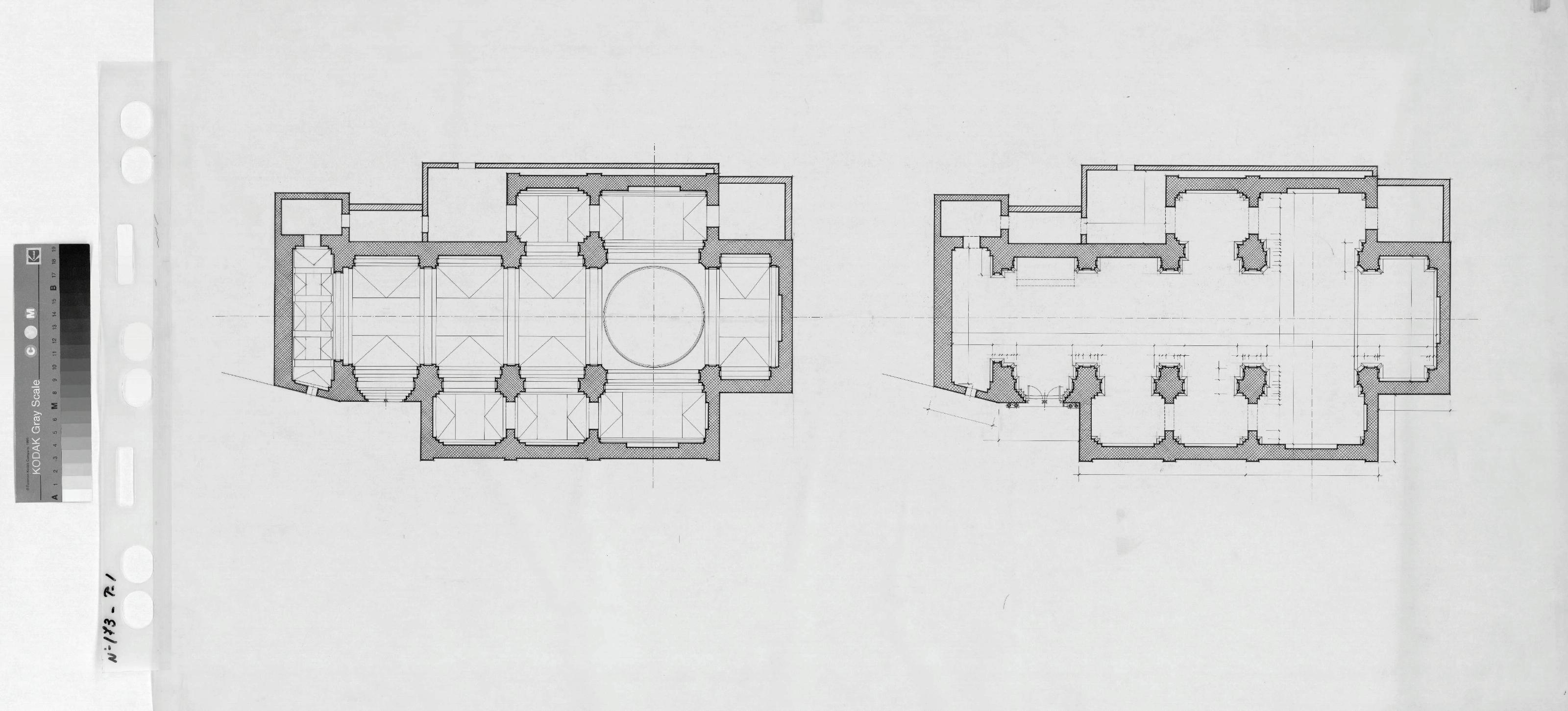 IGLESIA DE SAN NICOLAS: PLANTA GENERAL DE ACCESO Y PLANTA GENERAL CON PROYECCION DE TECHOS, LOS MUROS DE LAS PLANTAS ESTAN RALLADOS.PLANO SIN COTAS .
