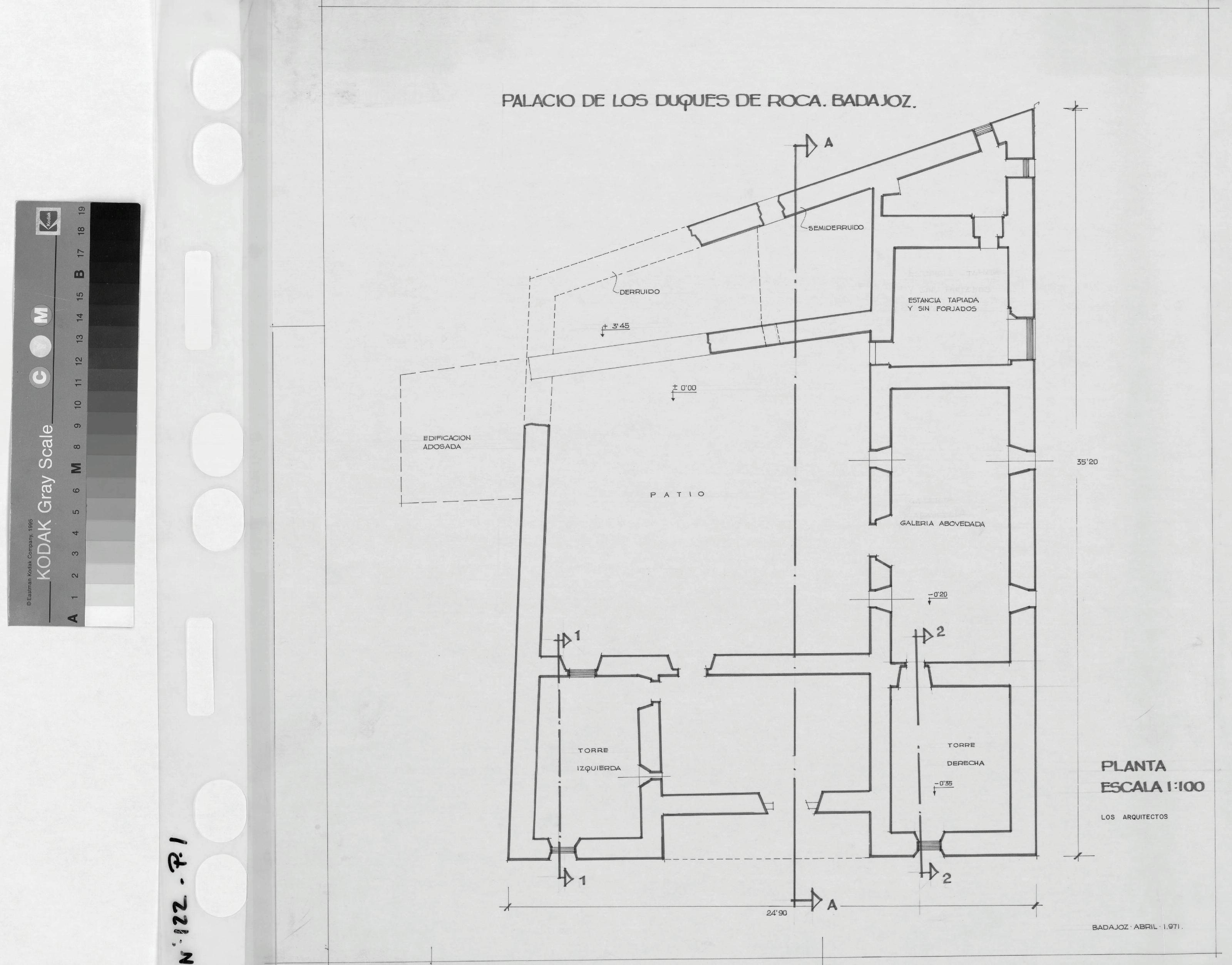 PALACIO DE LOS DUQUES DE ROCA (Badajoz): PLANTA con notas y usos Con medidas y cotas de nivel Con marcas de cortes para secciones