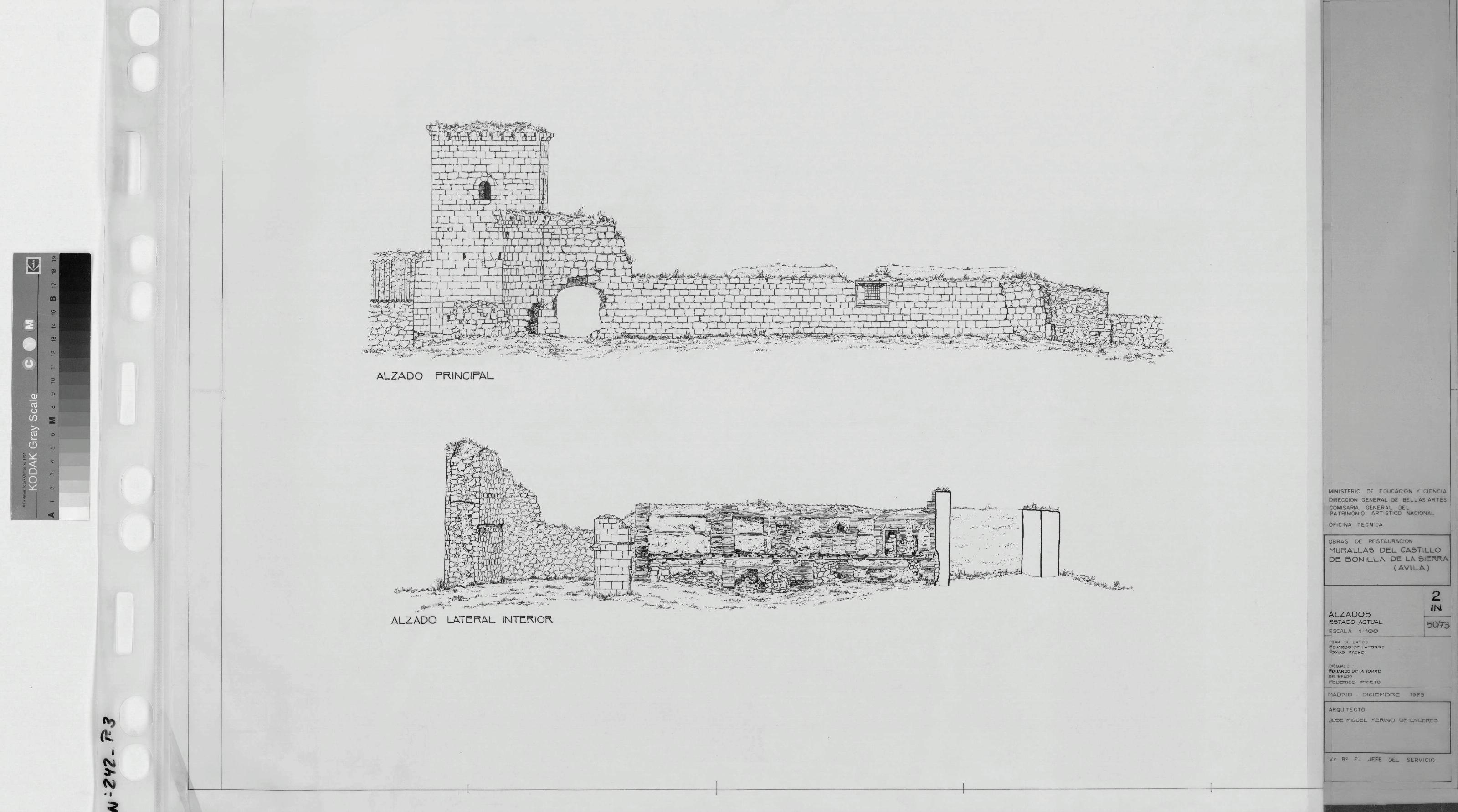 MURALLAS DEL CASTILLO: ALZADOS, ESTADO ACTUAL. EN ESTE PLANO TENEMOS DOS ALZADOS: PRINCIPAL Y LATERAL INTERIOR, DIBUJADOS CON DETALLE.