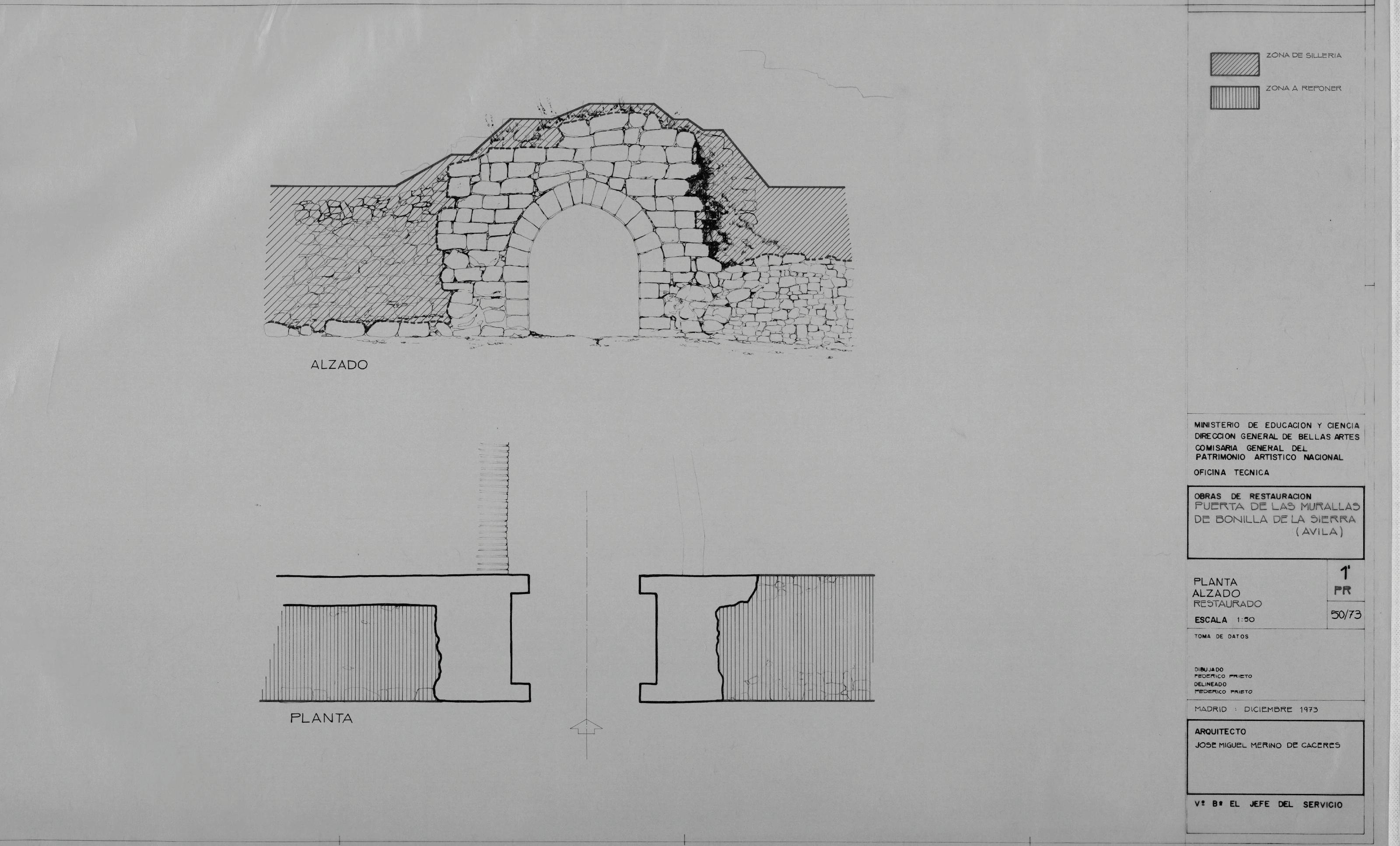 MURALLAS DEL CASTILLO: PLANTA Y ALZADO, REFORMADO. EN ESTE PLANO MARCA UNAS ZONAS A REPONER. PUERTA DE LA MURALLA.