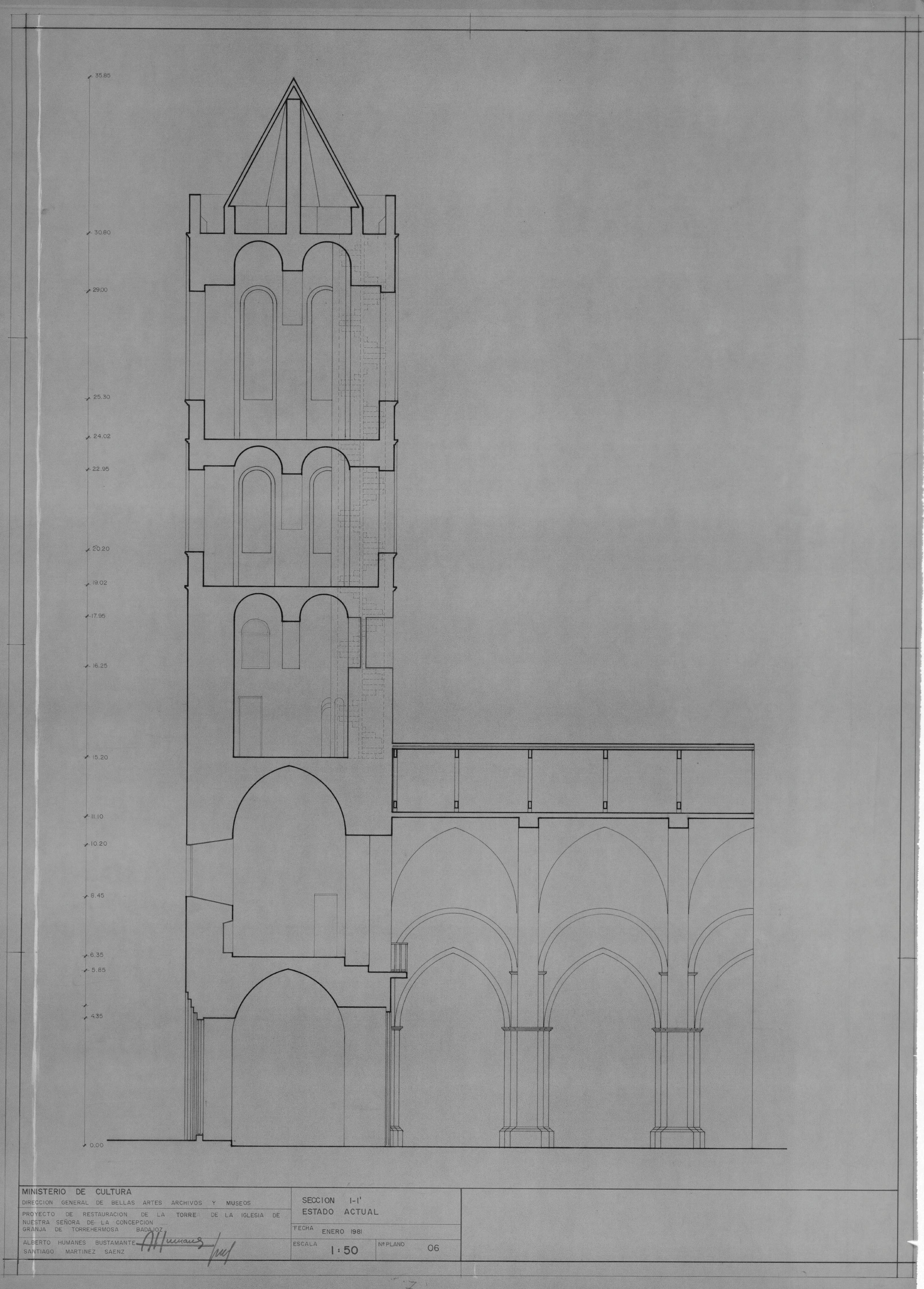 TORRE DE LA IGLESIA DE NUESTRA SEÑORA DE LA CONCEPCIONProyecto de RestauraciónGRANJA DE TORREHERMOSA (Badajoz): SECCION 1-1 ESTADO ACTUALAparece la torreCon cotas Firmado