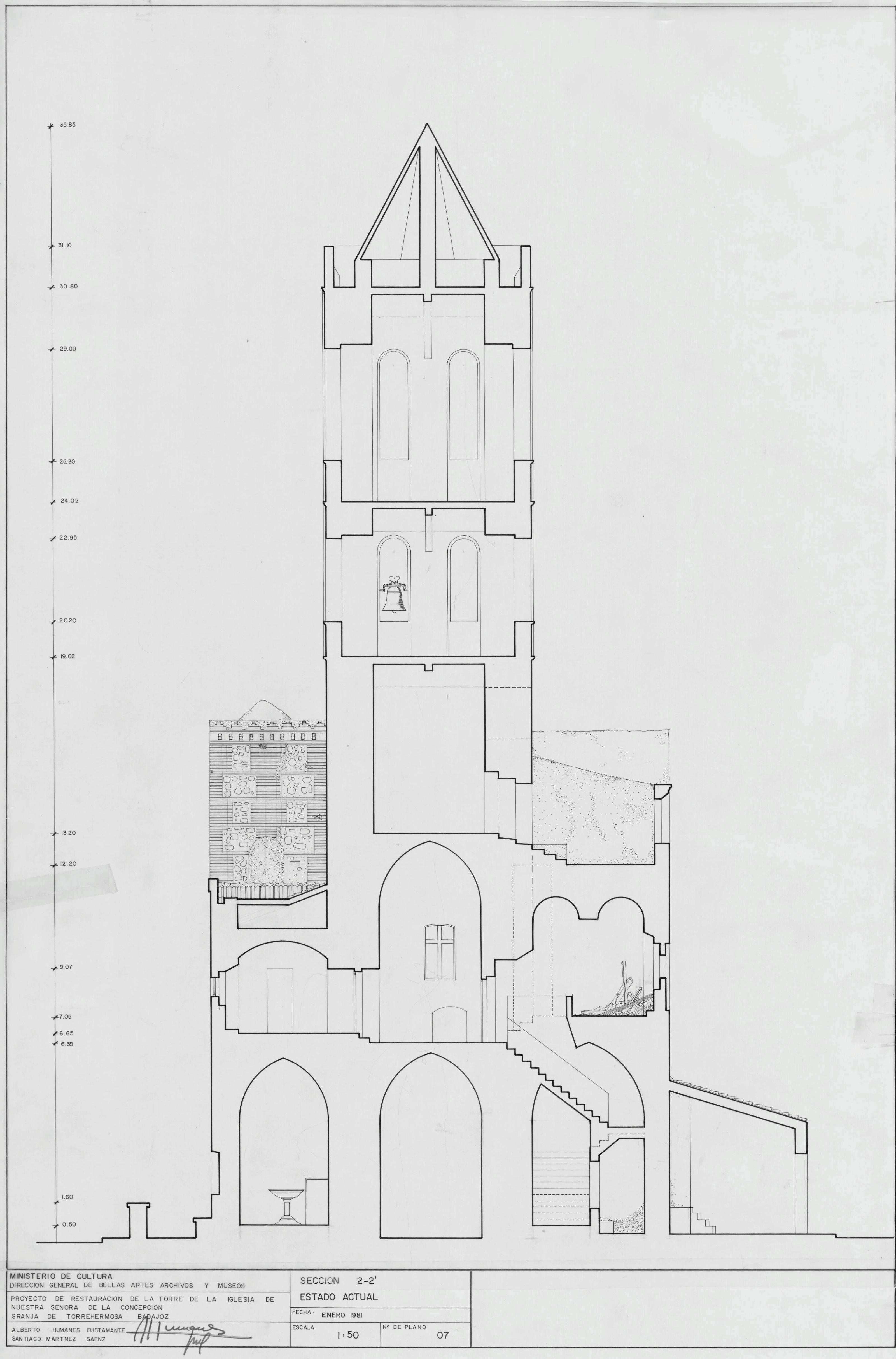 TORRE DE LA IGLESIA DE NUESTRA SEÑORA DE LA CONCEPCIONProyecto de RestauraciónGRANJA DE TORREHERMOSA (Badajoz): SECCION 2-2 ESTADO ACTUALAparece la torreCon cotas Firmado