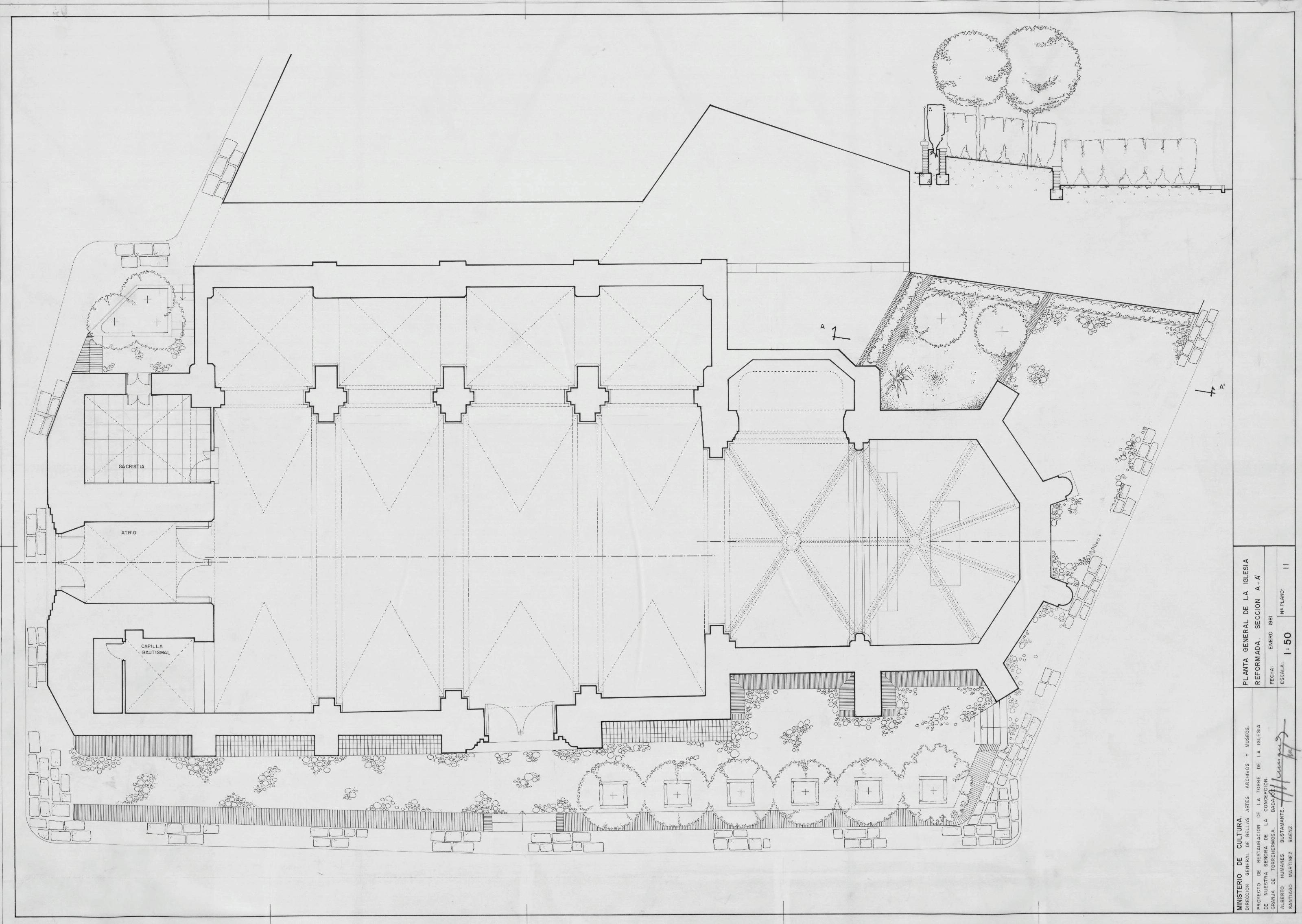 TORRE DE LA IGLESIA DE NUESTRA SEÑORA DE LA CONCEPCIONProyecto de RestauraciónGRANJA DE TORREHERMOSA (Badajoz): PLANTA GENERAL REFORMADA y SECCION A-ACon ajardinamiento exterior y acerado perimetral Con sección-detalle de banqueo terrenoCon denominación de usos y lineas de secciónFirmado