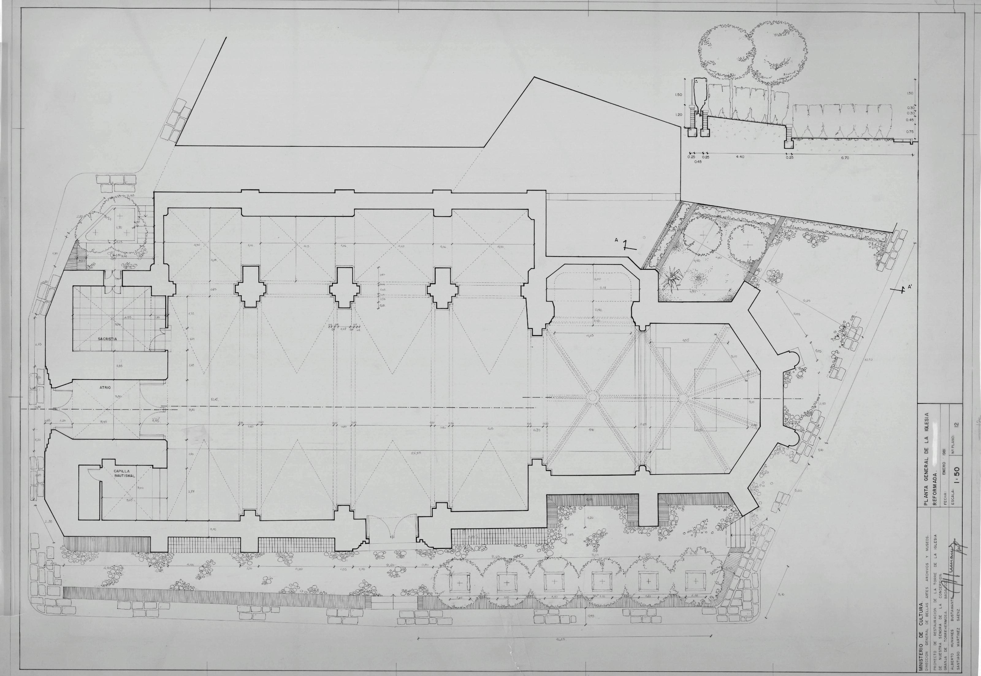 TORRE DE LA IGLESIA DE NUESTRA SEÑORA DE LA CONCEPCIONProyecto de RestauraciónGRANJA DE TORREHERMOSA (Badajoz): PLANTA GENERAL REFORMADA y SECCION A-AComo el anterior pero con cotasCon ajardinamiento exterior y acerado perimetral Con sección-detalle de banqueo terrenoCon denominación de usos y lineas de secciónFirmado