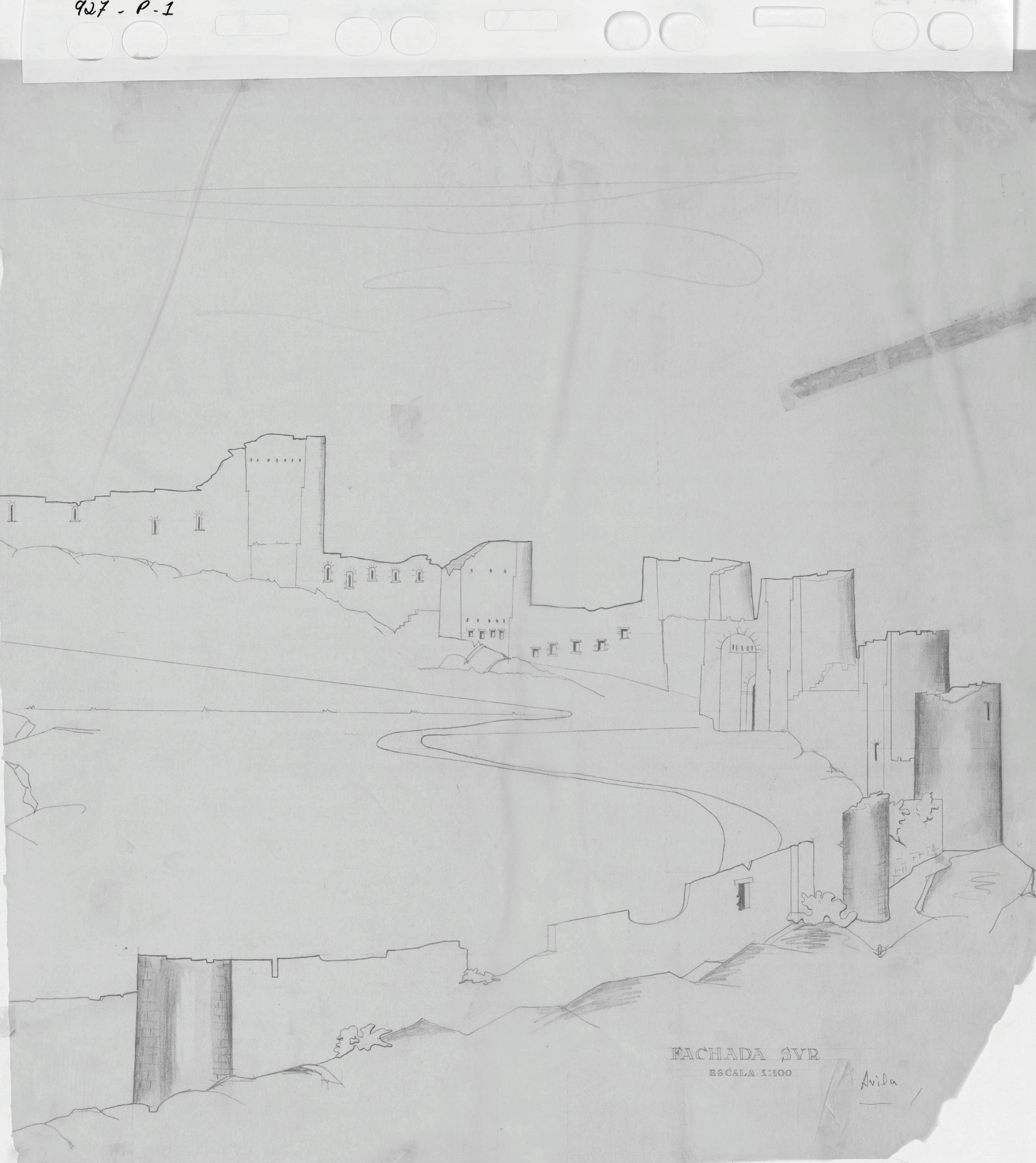 CASTILLO DE AVILA: FACHADA , Plano realizado a lapiz tipo croquis, sin escala sin cotas y no aparece ningun tipo de documentacion que asegure que los dibujos pertenecen al castillo, el plano esta inconpleto, falta parte de papel del plano.