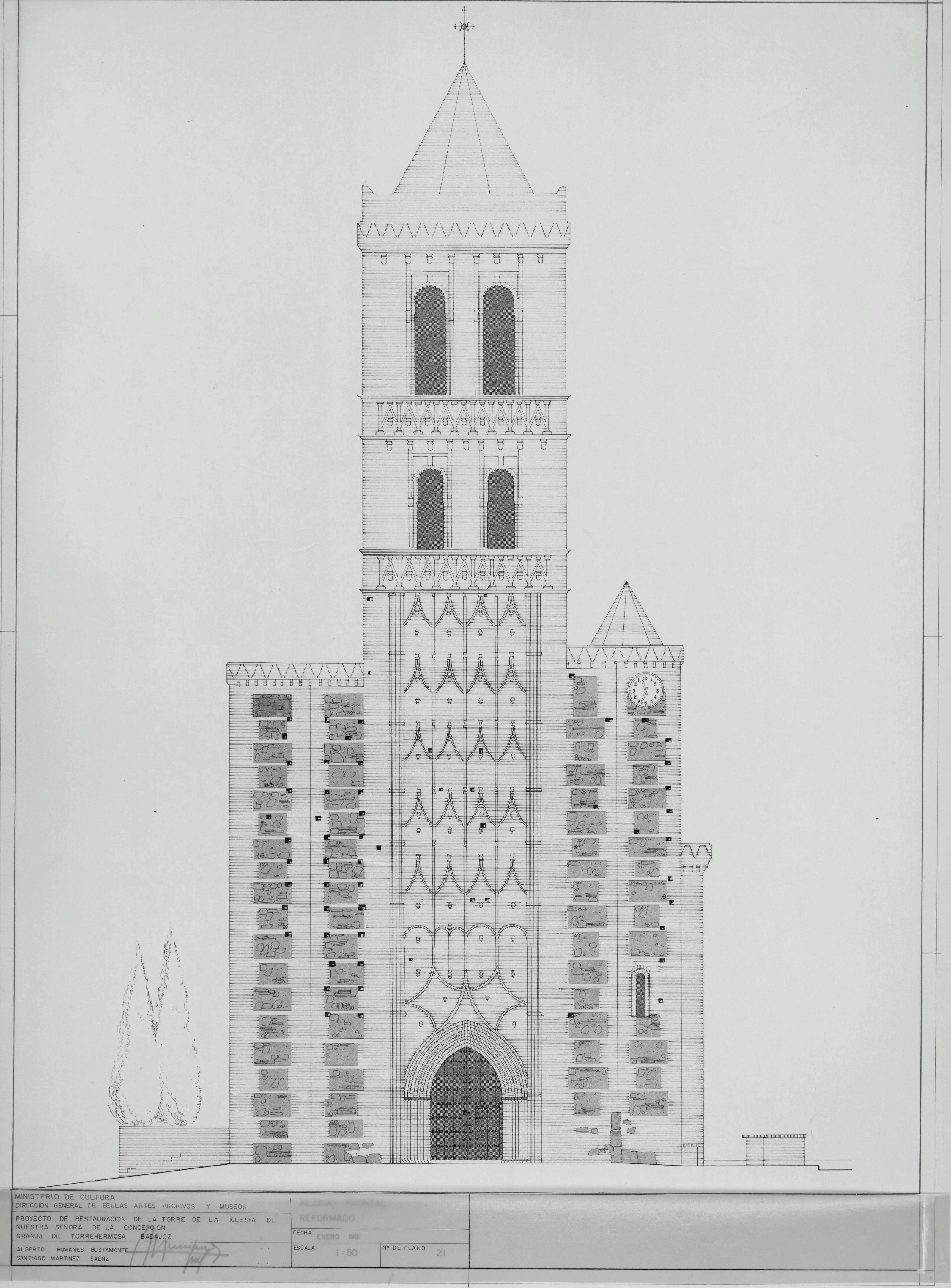 TORRE DE LA IGLESIA DE NUESTRA SEÑORA DE LA CONCEPCIONProyecto de RestauraciónGRANJA DE TORREHERMOSA (Badajoz): ALZADO FRONTAL REFORMADOMuy detallado, con ralladosFirmado