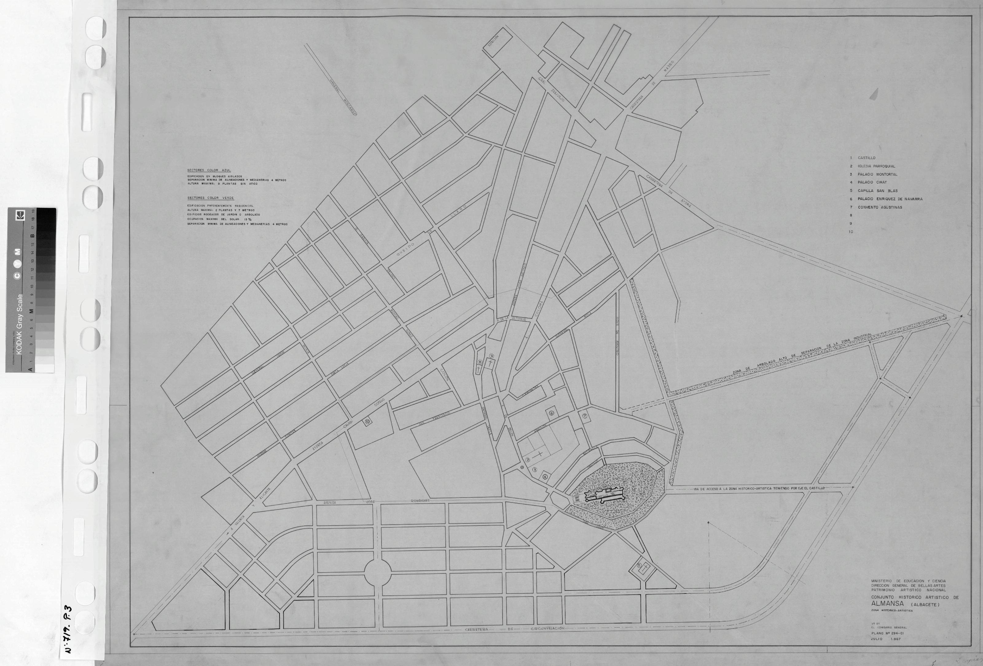 CONJUNTO HISTORICO ARTISTICO DE ALMANSA: PLANTA DEL CONJUNTO HISTORICO ARTISTICO CON DENOMINACION DE MONUMENTOS Y SECTORES DE EDIFICABILIDAD DE LA ZONA. PLANTA DEL CASTILLO SECCIONADA Y TRATAMIENTO DE LA ZONA COLINDANTE AL CASTILLO