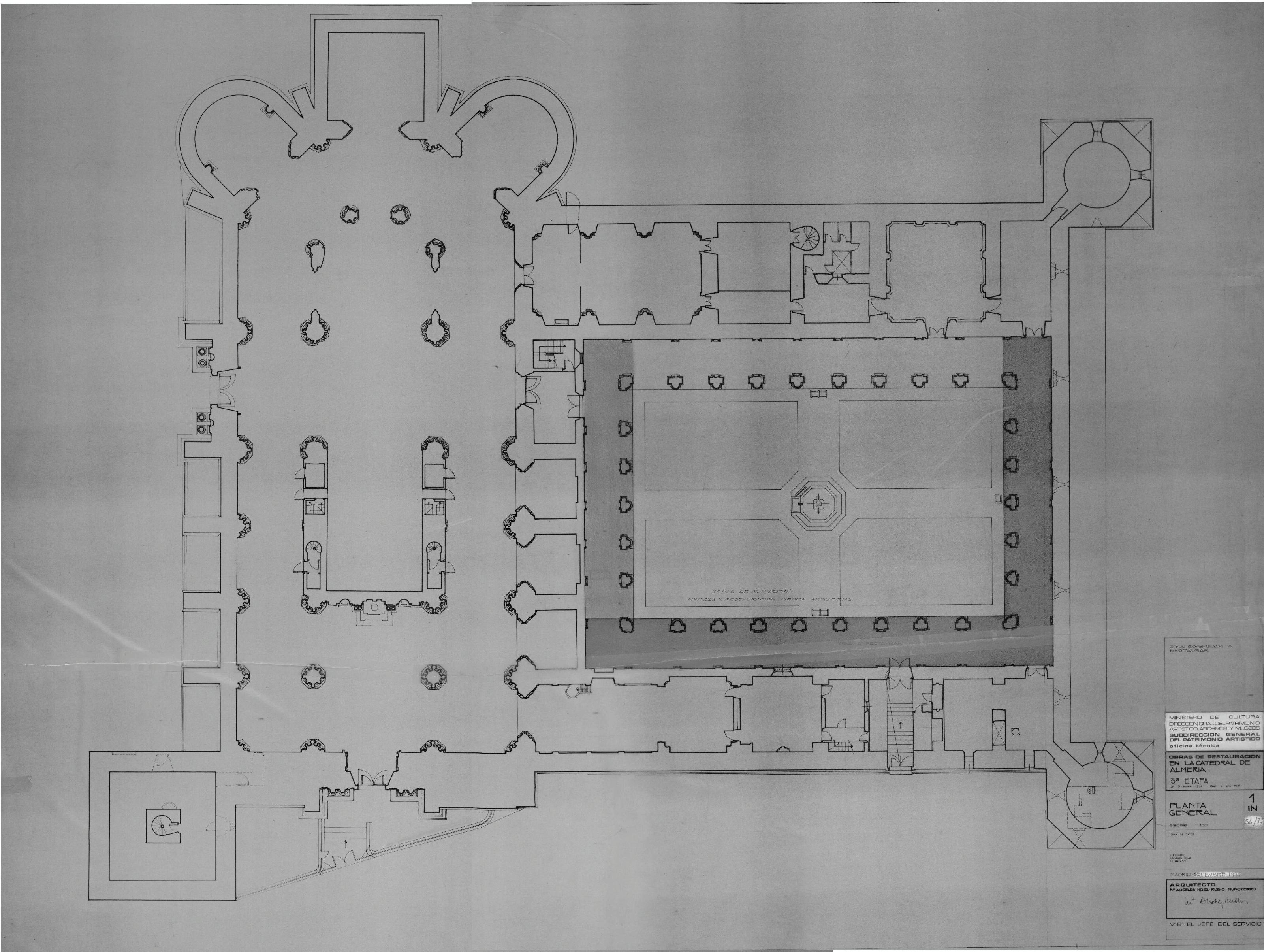 OBRAS DE RESTAURACION EN LA CATEDRAL DE ALMERIA3ª ETAPA: PLANTA GENERALCon descripción de zonas de actuaciónSombreado con gasolina y grafito