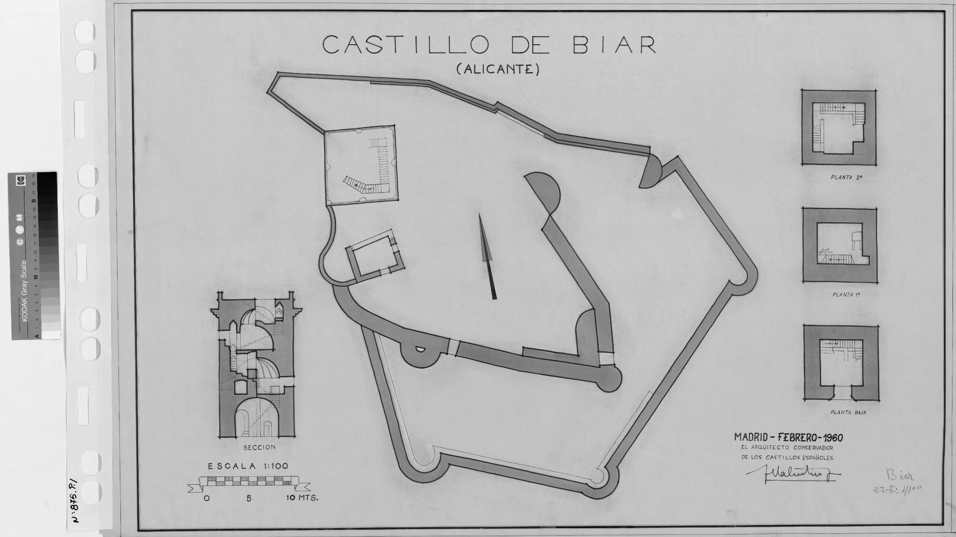 CASTILLO DE BIAR: ESTE PLANO SE COMPONE DE UNA PLANTA GENERAL DEL CASTILLO, TRES PLANOS DE PLANTA DE LA TORRE Y UNA SECCION, LOS MUROS DE LA PLANTA GENERAL Y TORRE ESTAN REGRUESADOS Y SOMBREADOS.