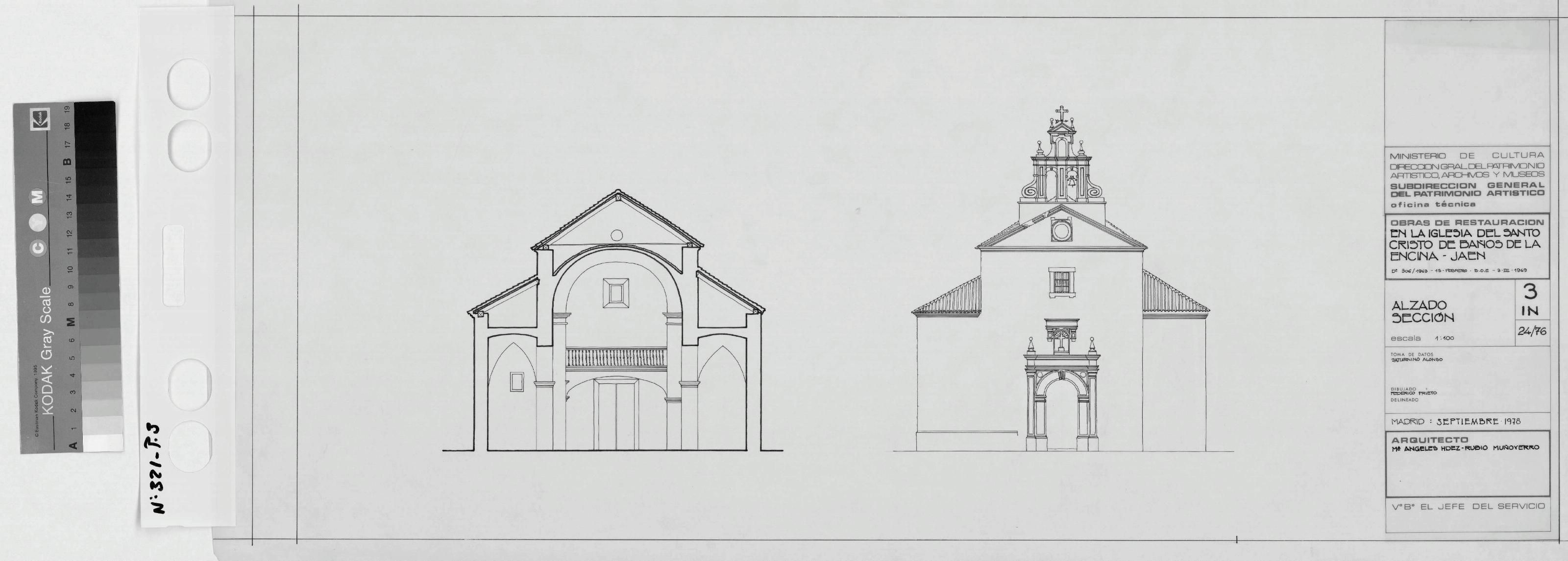 IGLESIA DEL SANTO CRISTO DE BAÑOS DE LA ENCINA - JAEN.: ALZADO Y SECCION.Plano donde aparece dibujado un alzado y seccion. plano sin cotas.