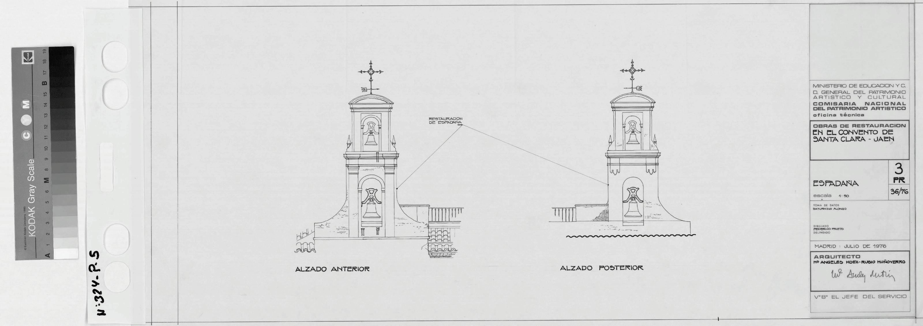 CONVENTO DE SANTA CLARA. - JAEN.: ESPADAÑA, ALZADO ANTERIOR Y ALZADO POSTERIOR., Plano donde aparece marcada la zona de actuacion, plano sin cotas.