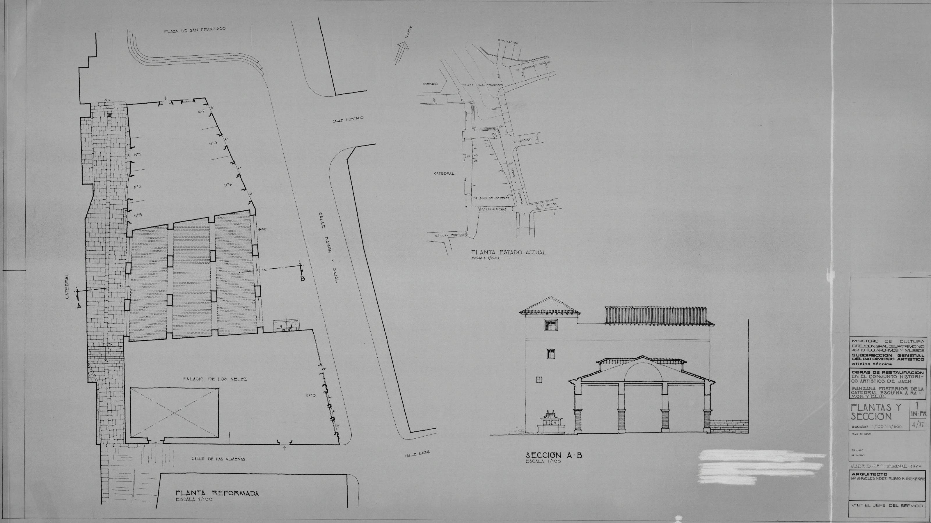 CONJUNTO HISTORICO ARTISTICO DE - JAEN -: PLANTAS Y SECCION. MANZANA POSTERIOR DE LA CATEDRAL ESQUINA A RAMON Y CAJAL. Plano de planta reformado y actual.sin cotas.