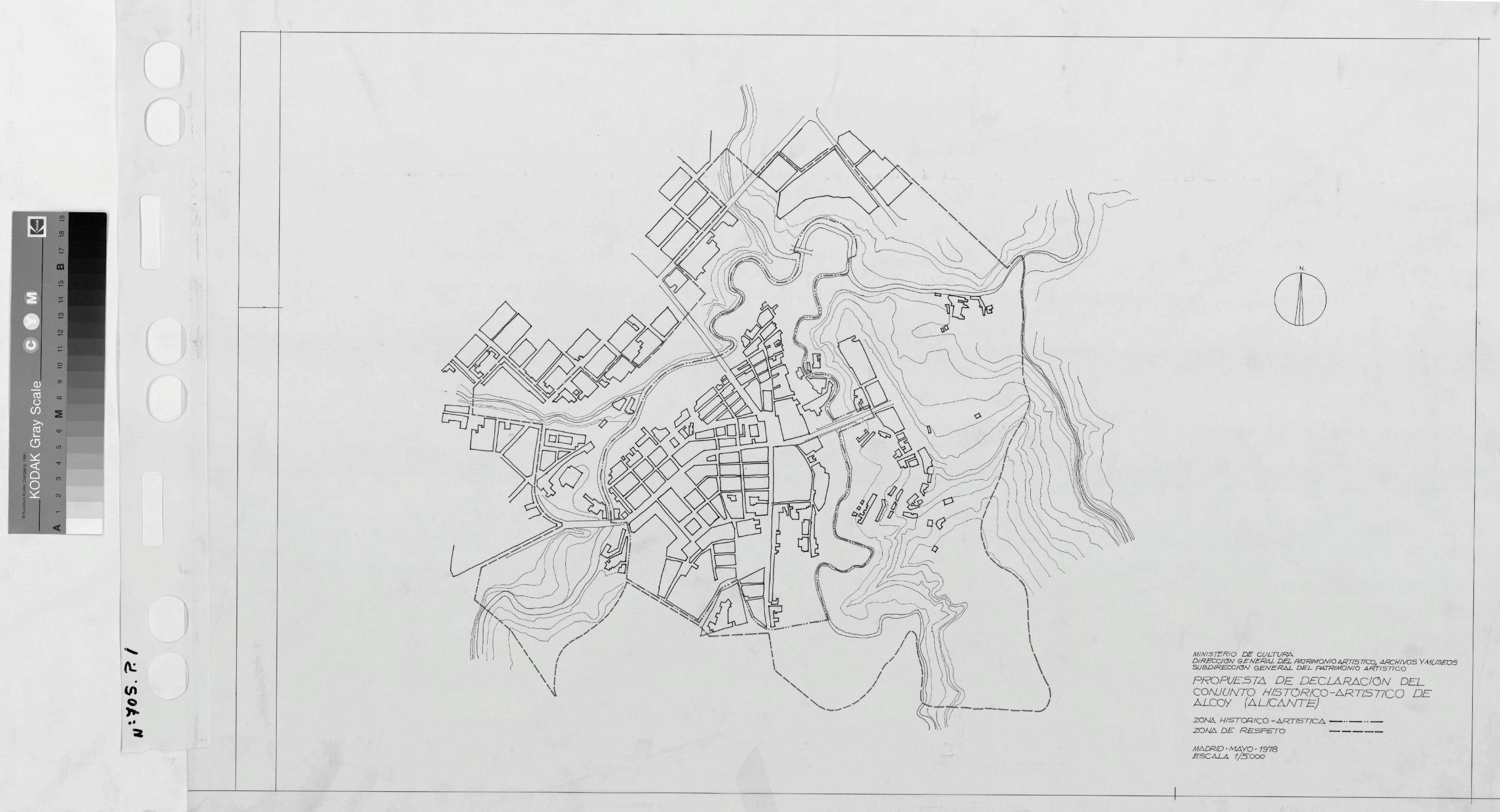 CONJUNTO HISTORICO ARTISTICO DE ALCOY: PLANTA GENERAL DEL RECINTO , PLANO CON DESCRIPCION DE CURVAS DE NIVEL , ESTE PLANO ES UNA PROPUESTA DE DECLARACION DEL CONJUNTO, MARCA UNA ZONA DE RESPETO Y UNA ZONA HISTORICA-ARTISTICA.