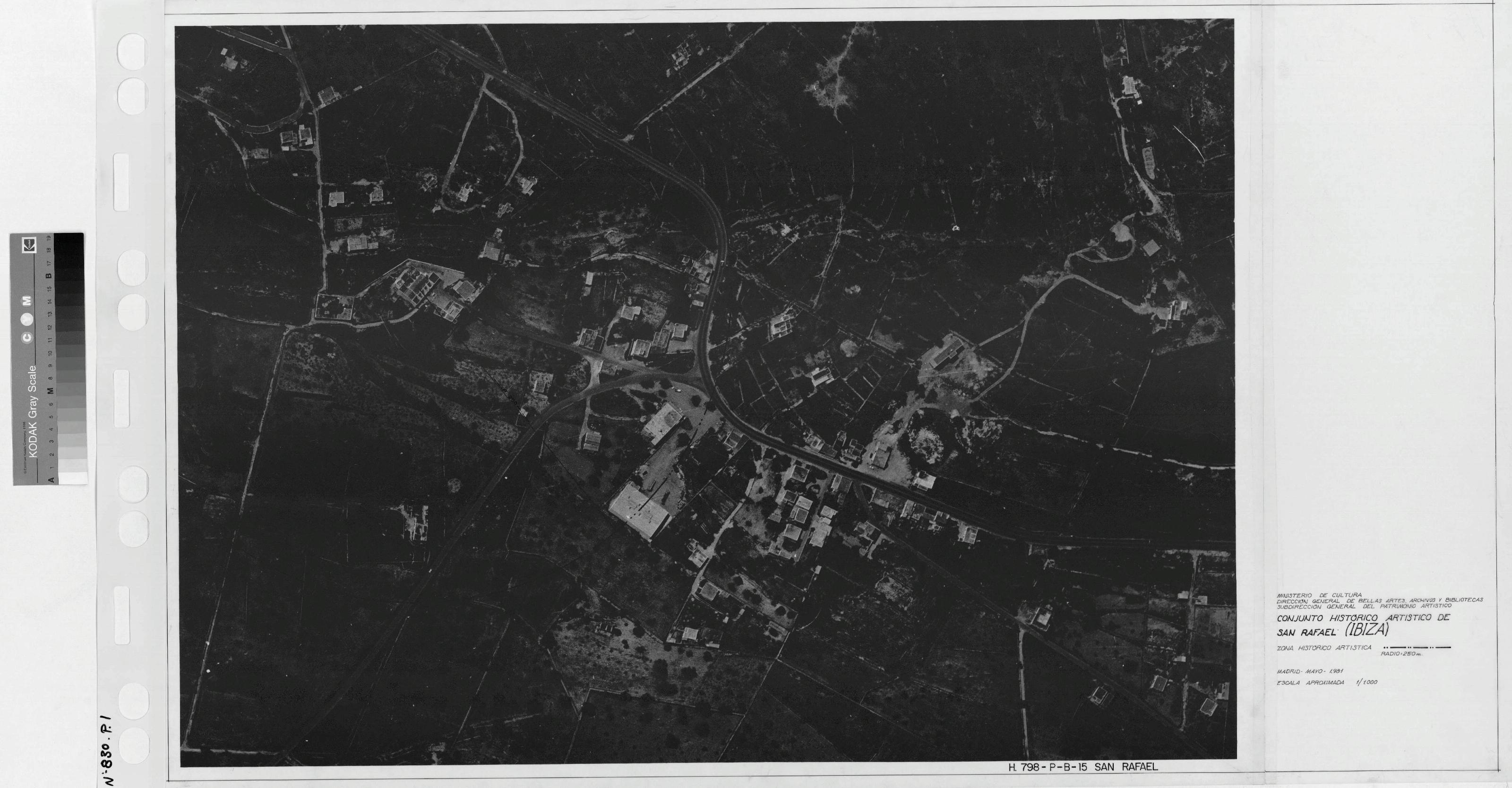 CONJUNTO HISTORICO ARTISTICO DE SAN RAFAEL -IBIZA-: VISTA AEREA. Este plano marca una zona historica artistica, de un radio de 250m.