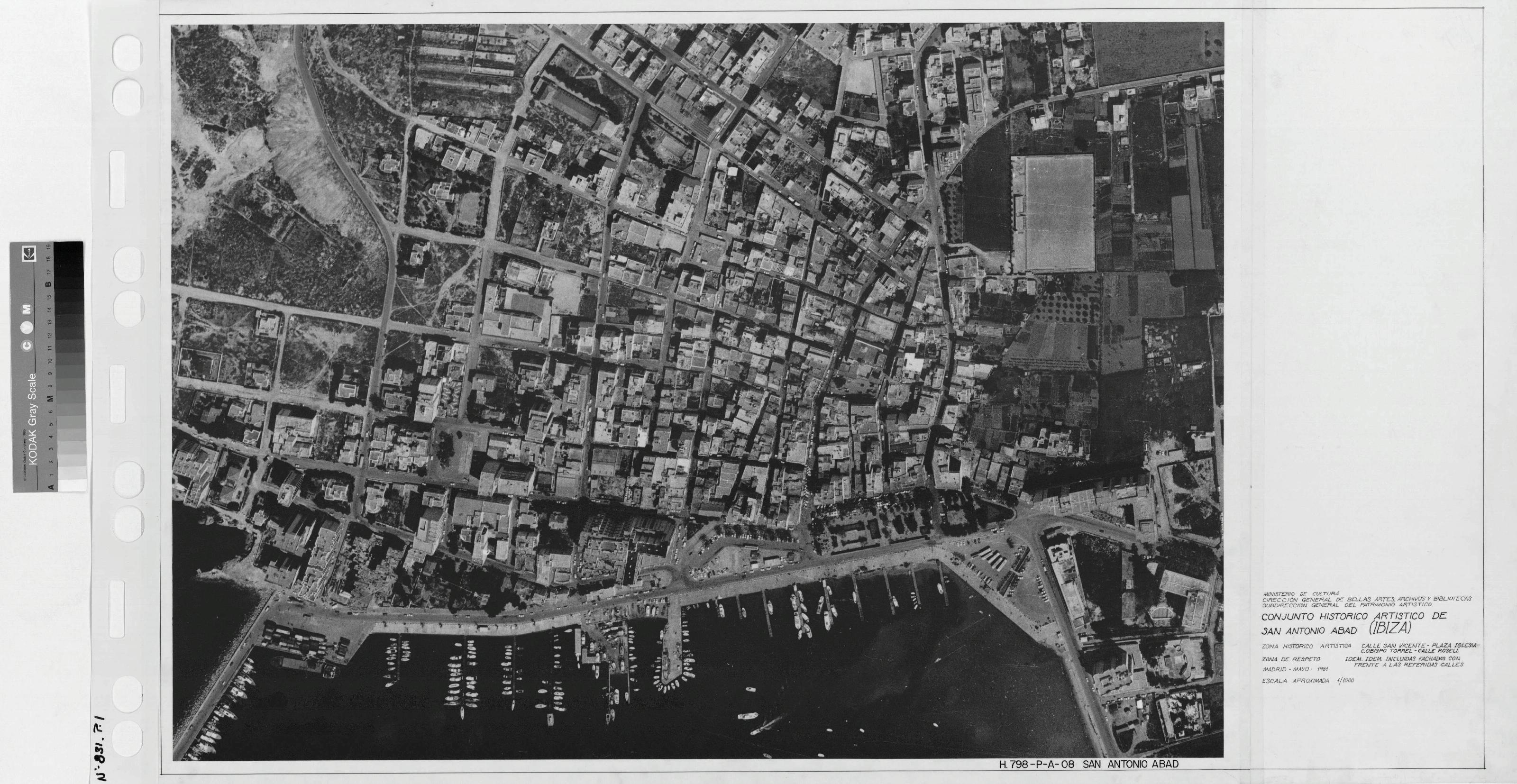 CONJUNTO HISTORICO ARTISTICO DE SAN ANTONIO ABAD -IBIZA-: VISTA AEREA. Este plano marca una zona historica artistica, en la calle San Vicente ,Plaza Iglesia, calle Obispo Torrel, calle Rosel, y otra zona de respeto, idem idem. Incluidas fachadas con frente a las referidas calles.