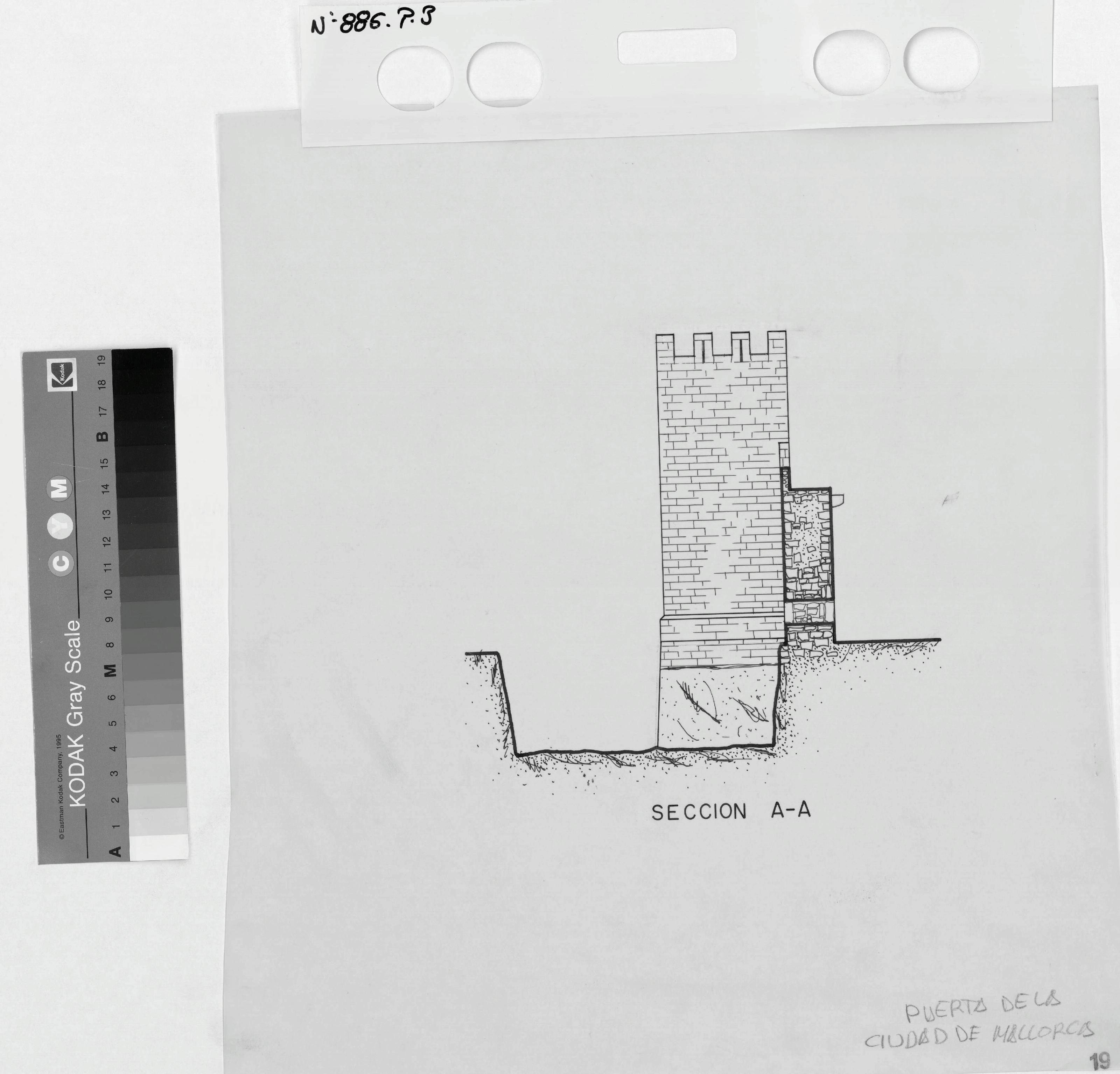 PUERTA DE LA CIUDAD DE MALLORCA O DE SAN SEBASTIAN.: ALZADO y SECCION.Este plano marca la puerta de la ciudad de Mallorca, No tiene cotas ni escala y no es seguro que este pueda ser su B.I.C. SECCION A-A