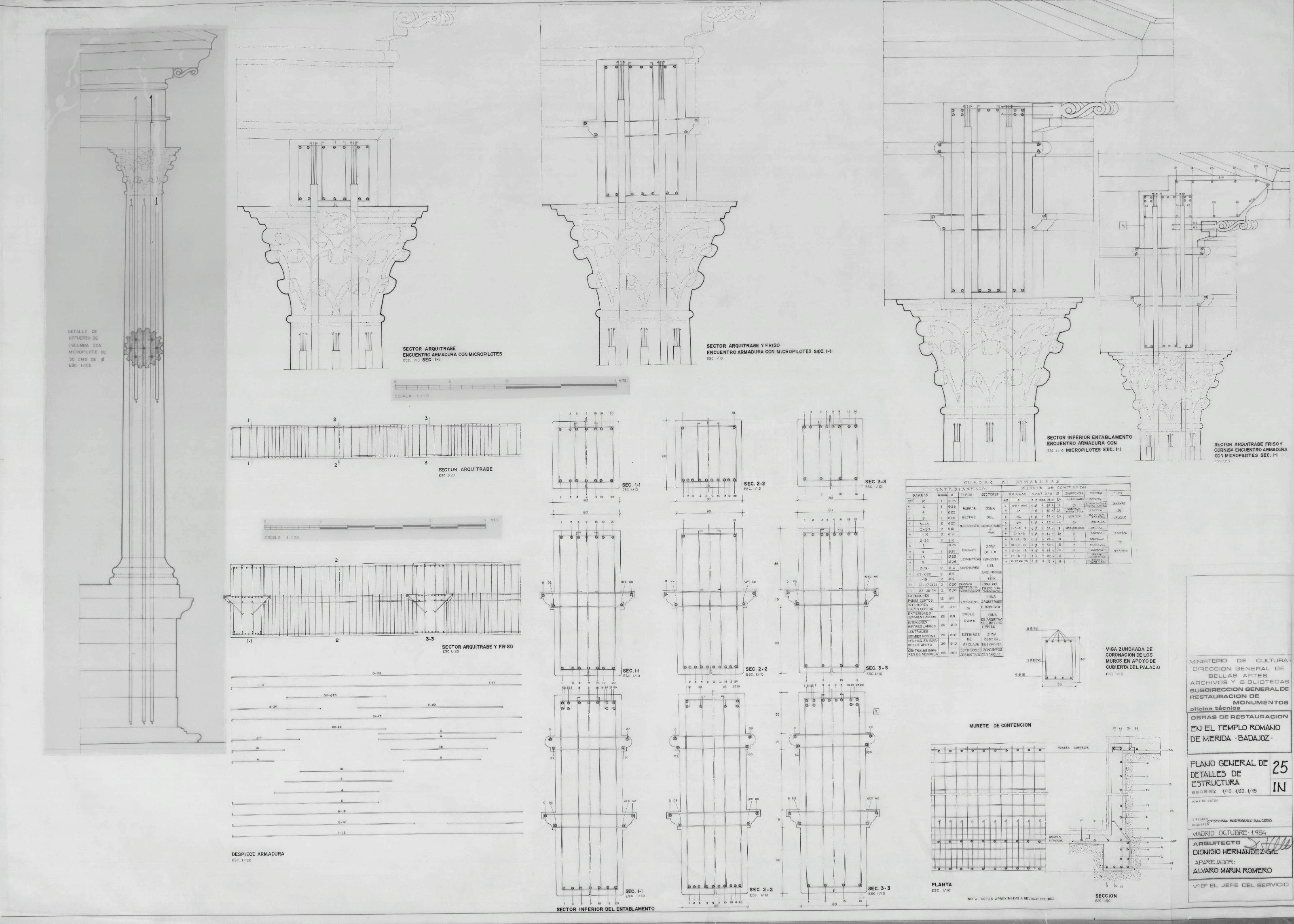 OBRAS DE RESTAURACION EN EL TEMPLO ROMANO DE MERIDA (Badajoz): PLANO GENERAL DE DETALLES DE ESTRUCTURA Con despieces de Armaduras detallando calibres y medidas en Arquitrabe Entablamento y Murete de contención a E: 1/10, 1/15, y 1/20 Con cuadros de armaduras Con detalle de refuerzo de columa con micropilote a E: 1/25 Con escala gráfica y Firmado