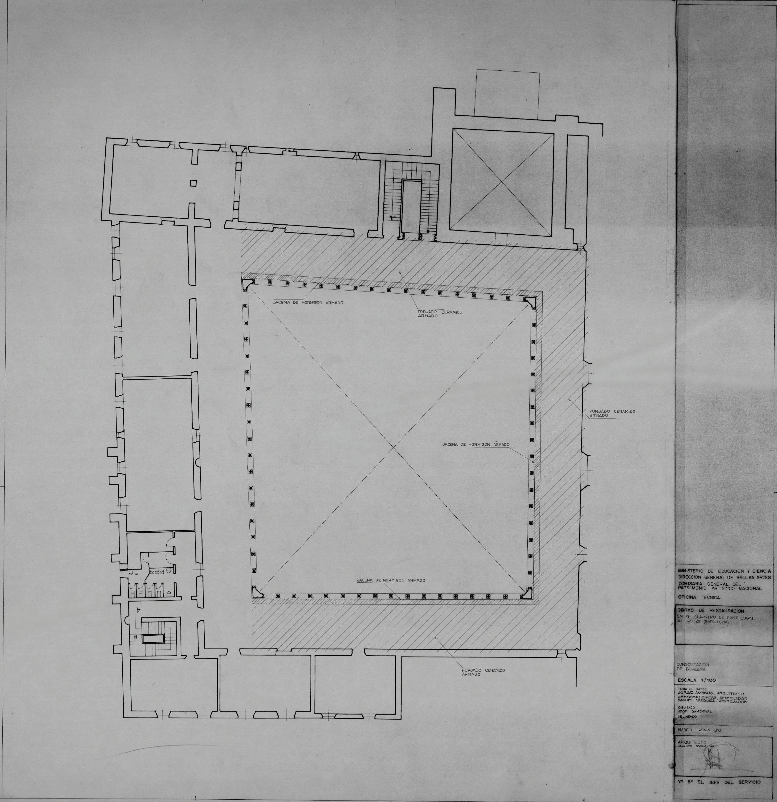 CLAUSTRO DE SAN CUGAT DE VALLES- BARCELONA-: PLANTA .CONSOLIDACION DE BOVEDAS. Este plano nos marca las distintas zonas de actuacion , materiales y elementos a consolidar.