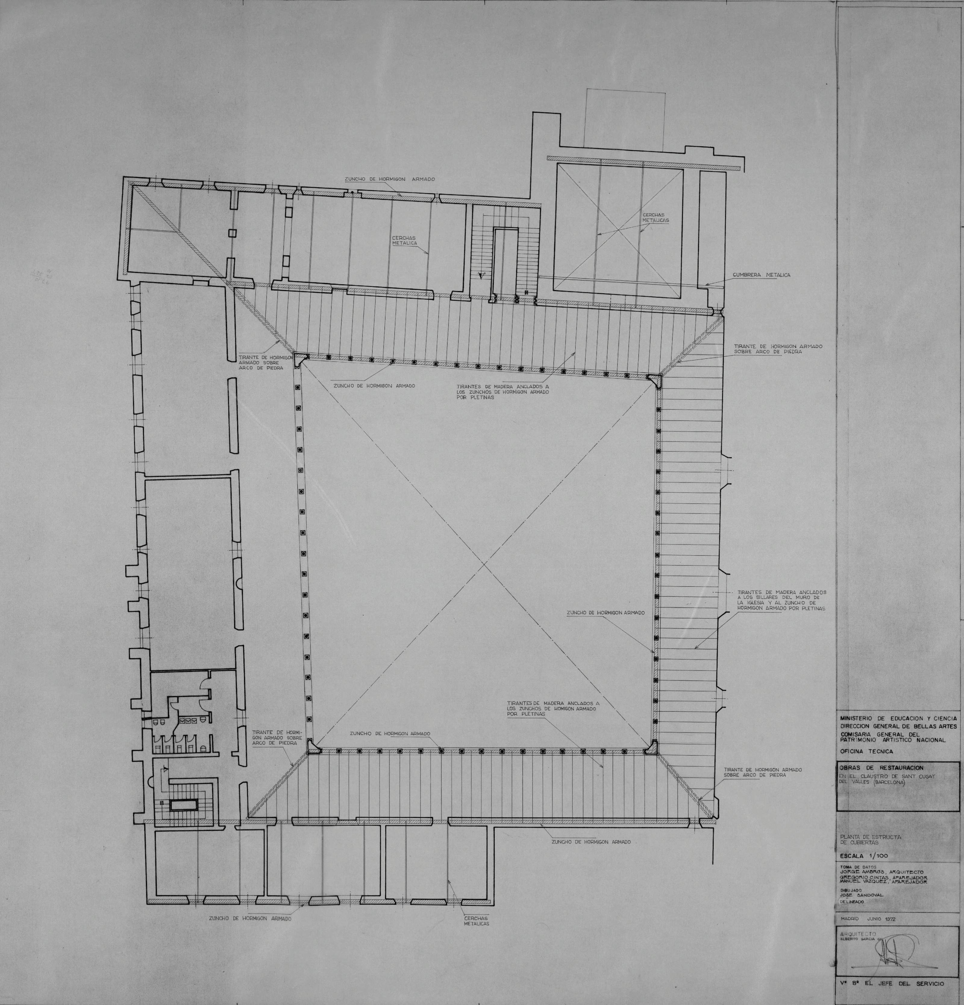 CLAUSTRO DE SAN CUGAT DE VALLES- BARCELONA-: PLANTA DE ESTRUCTURA DE CUBIERTA. Descripcion de elelementos y materiales de que se compone la cubierta y zonas a reparar.
