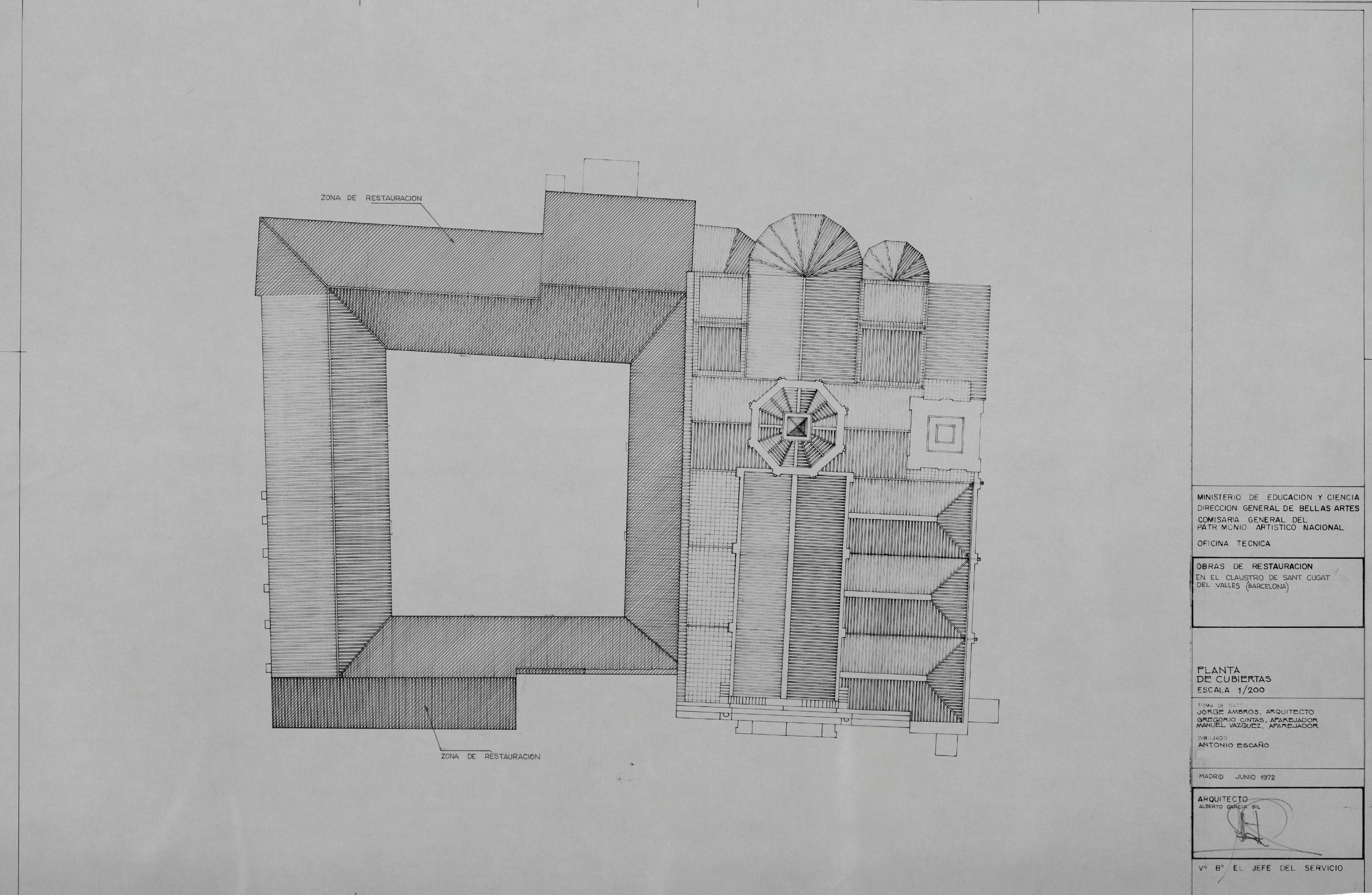 CLAUSTRO DE SAN CUGAT DE VALLES- BARCELONA-: PLANTA DE CUBIERTAS. Plano sin acotar,marca la zona a restaurar en el claustro.