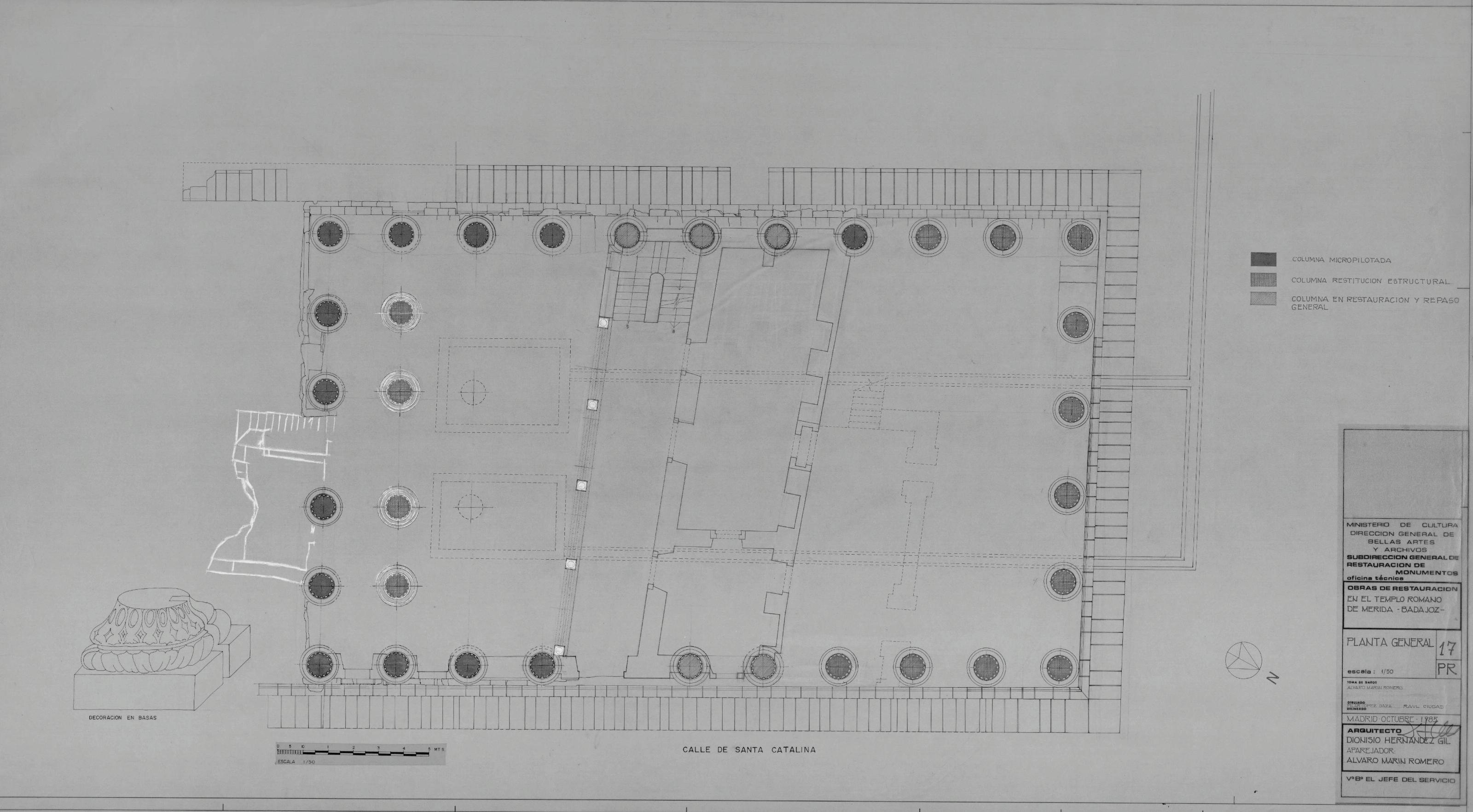 OBRAS DE RESTAURACION EN EL TEMPLO ROMANODE MERIDA (Badajoz): PLANTA GENERALEspecificando con diferentes rallados las columnas micropilotadas, las de restitución estructural y las de restauración y repaso generalCon detalle de decoración en basasCon escala gráfica y Firmado