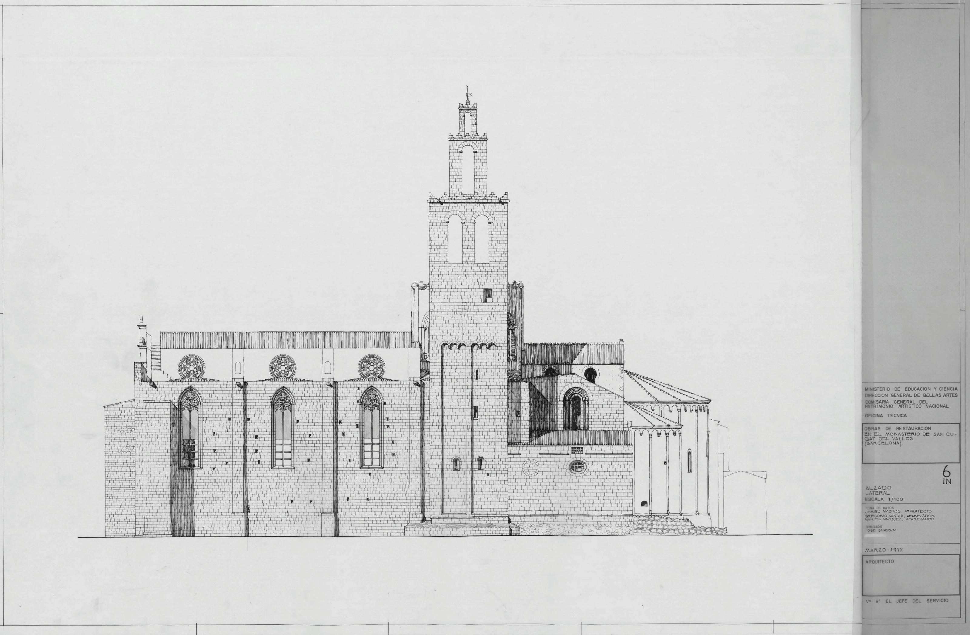 MONASTERIO DE SAN CUGAT DE VALLES- BARCELONA-: ALZADO LATERAL. Es un plano que esta dibujado con muchisimo detalle,se puede ver el dibujo de las ventanas con vidrieras ,los rosetones, toda la piedra de fachada etc. Plano sin cotas.