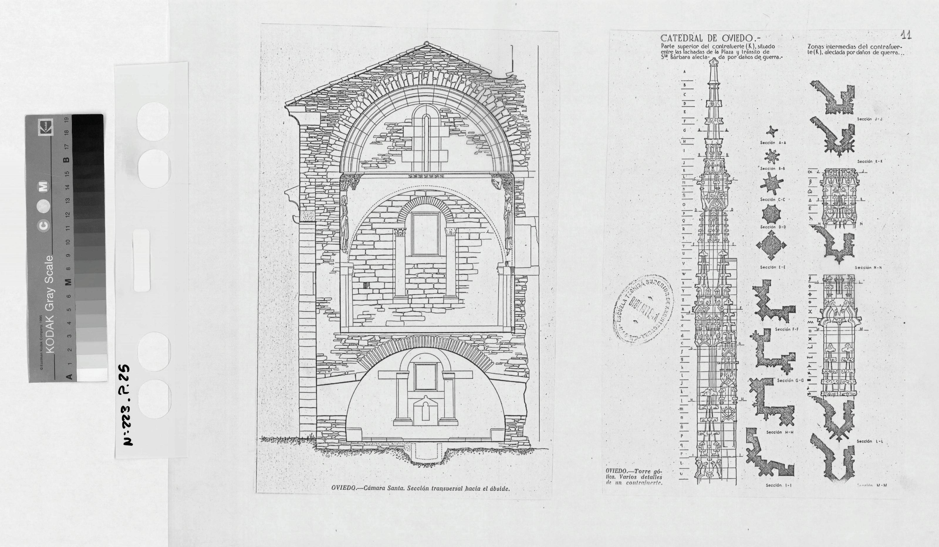 CATEDRAL BASILICA DEL SALVADOR- SANTA IGLESIA CATEDRAL DE OVIEDO: CAMARA SANTA SECCION TRANSVERSAL HACIA EL ABSIDE TORRE DE LA CATEDRAL, PARTE SUPERIOR DEL CONTRAFUERTE SITUADO ENTRE LAS FACHADAS DE LA PLAZA Y TRANSITO DE SANTA BARBARA AFECTADA POR DAÑOS DE GUERRA.