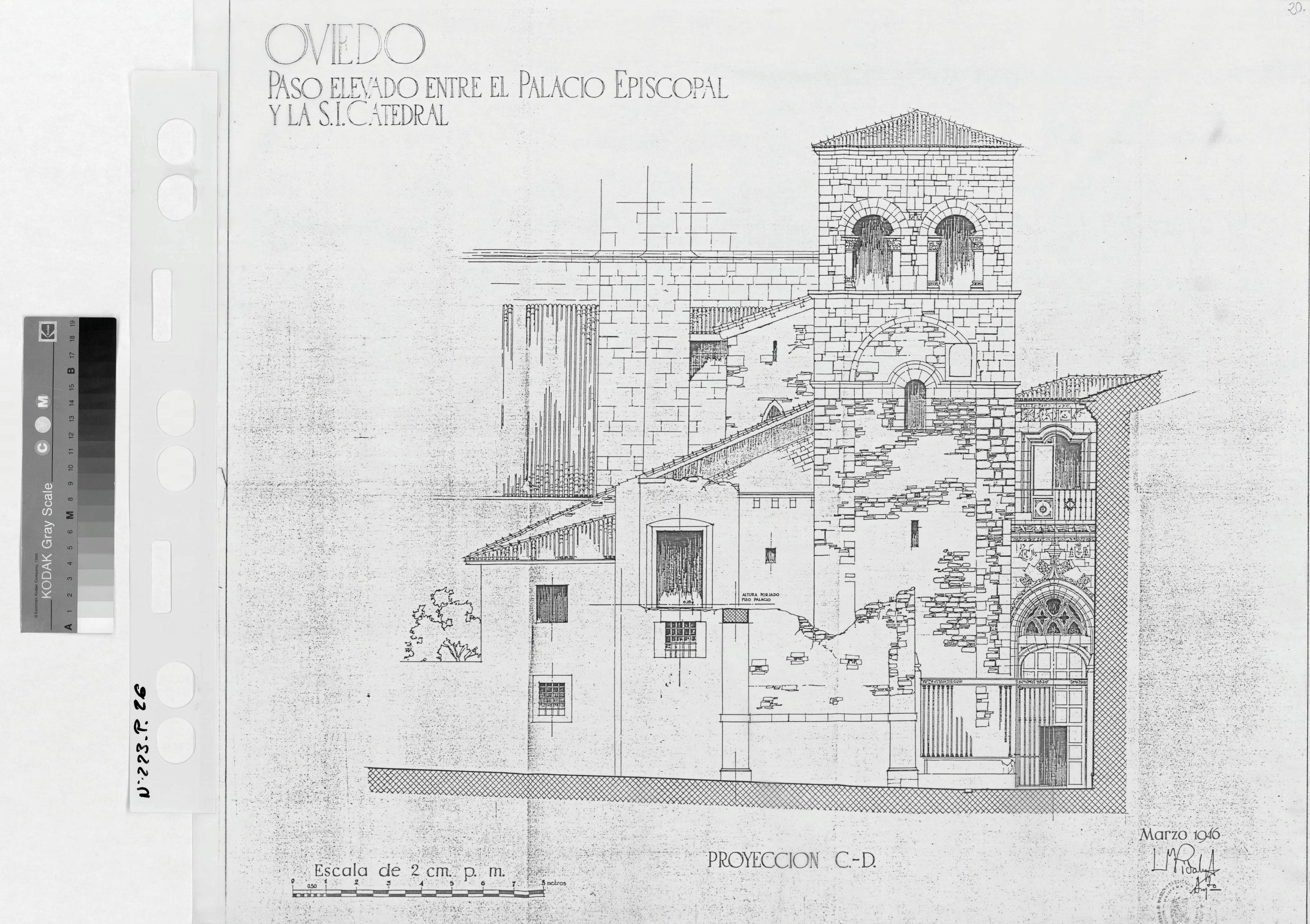 CATEDRAL BASILICA DEL SALVADOR- SANTA IGLESIA CATEDRAL DE OVIEDO: PASO ELEVADO ENTRE PALACIO EPISCOPAL Y LA S.I. CATEDRAL- PROYECCION C-D ALZADO CON INDICACION DEL NIVEL DEL FORJADO DEL PALACIO
