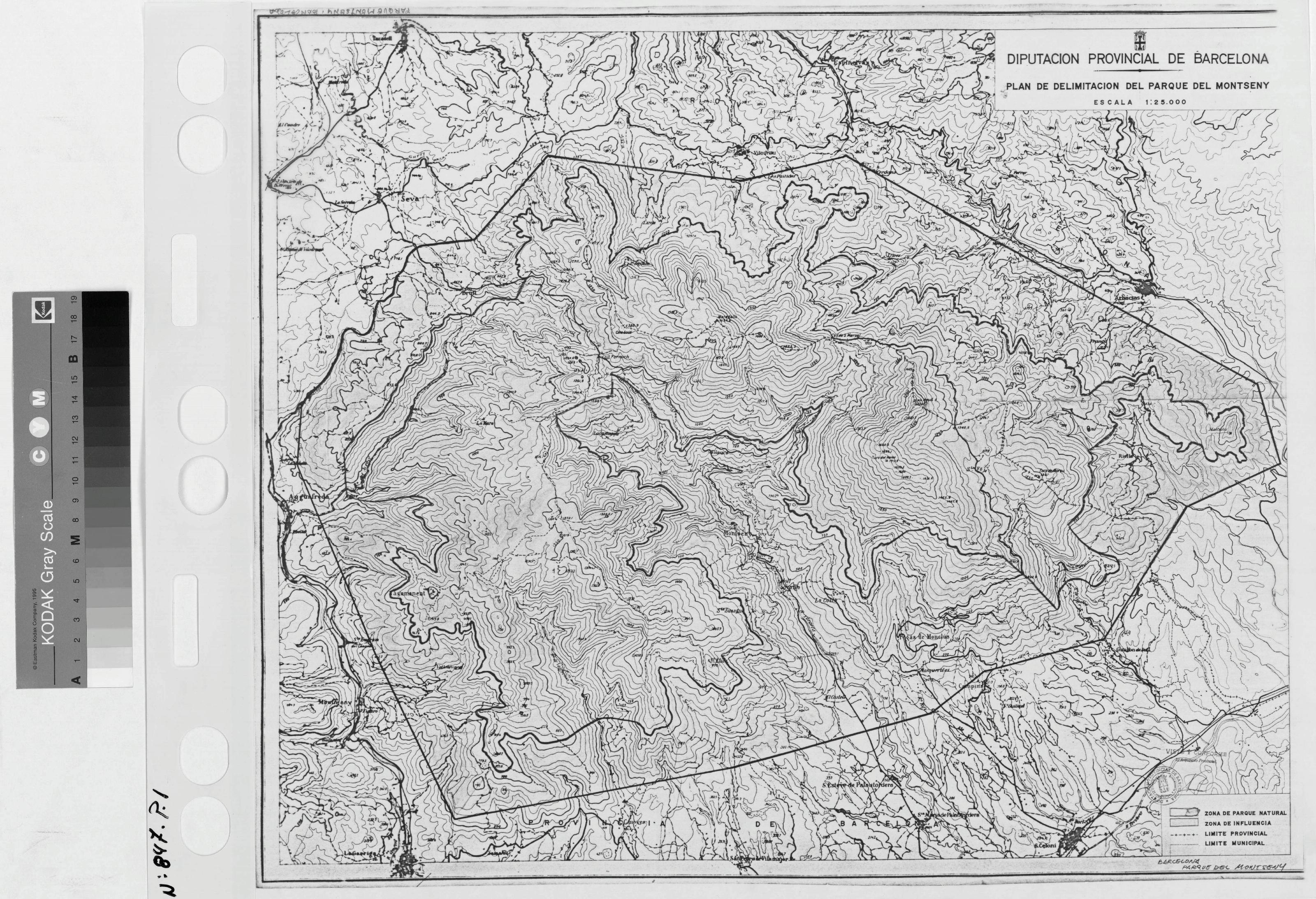 DELIMITACION DEL PARQUE DEL MONTSENY- BARCELONA-: PLANO TOPOGRAFICO O DE EMPLAZAMIENTO. En este plano esta marcado la delimitacion del parque, es una reduccion, nos describe cuatro zonas como: zona de parque natural, zona de influencia, limite privincial y limite municipal.