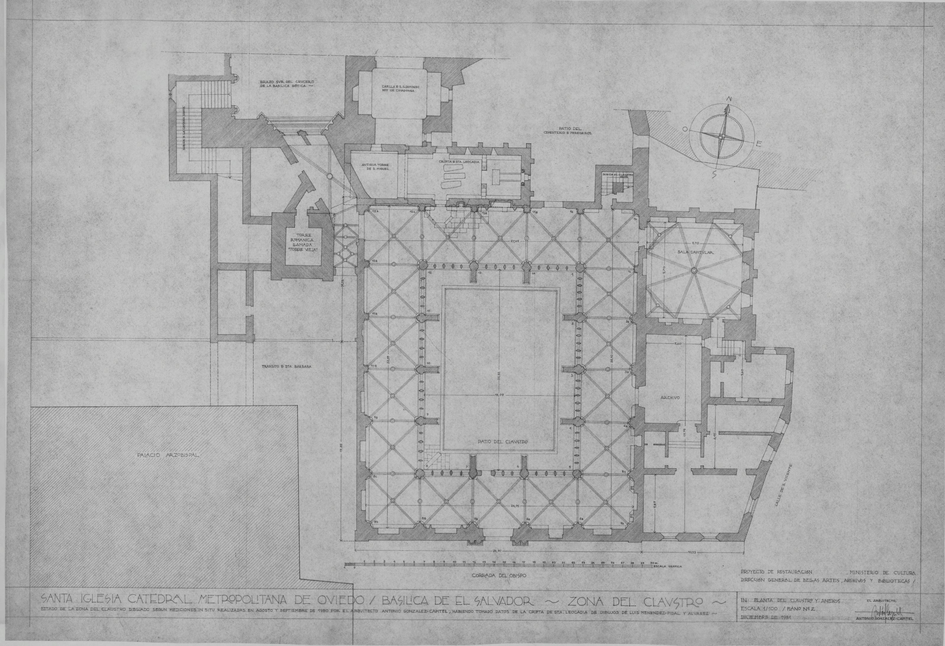 CATEDRAL BASILICA DEL SALVADOR- SANTA IGLESIA CATEDRAL DE OVIEDO: PLANTA DEL CLAUSTRO Y ANEXOS, MUROS RAYADOS CON DENOMINACION DE USOS Y COTAS