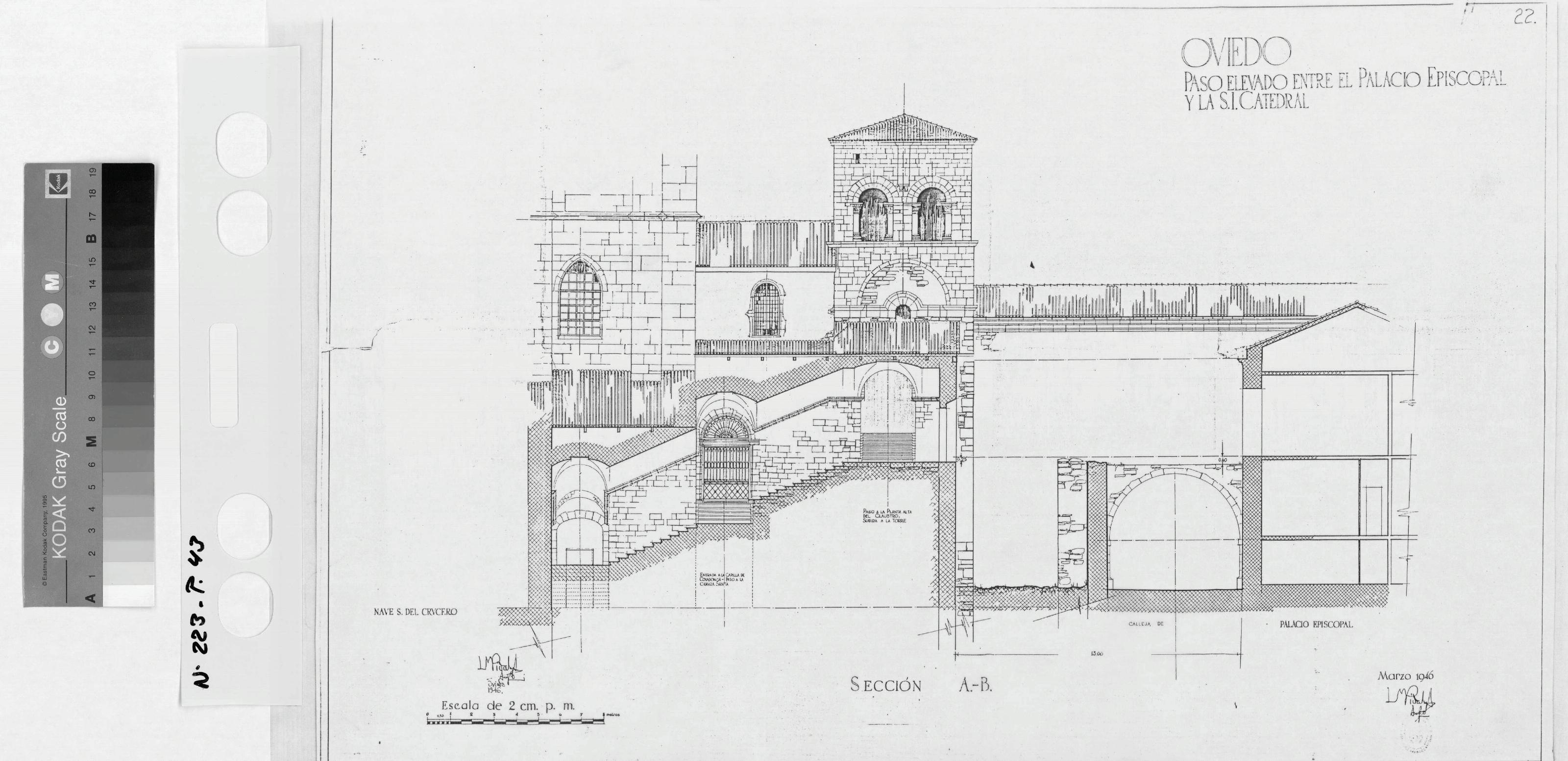 CATEDRAL BASILICA DEL SALVADOR- SANTA IGLESIA CATEDRAL DE OVIEDO: PASO ELEVADO ENTRE PALACIO EPISCOPAL Y LA S.I. CATEDRAL, SECCION POR ESCALINATA INDICANDO LOS DISTINTOS ACCESOS