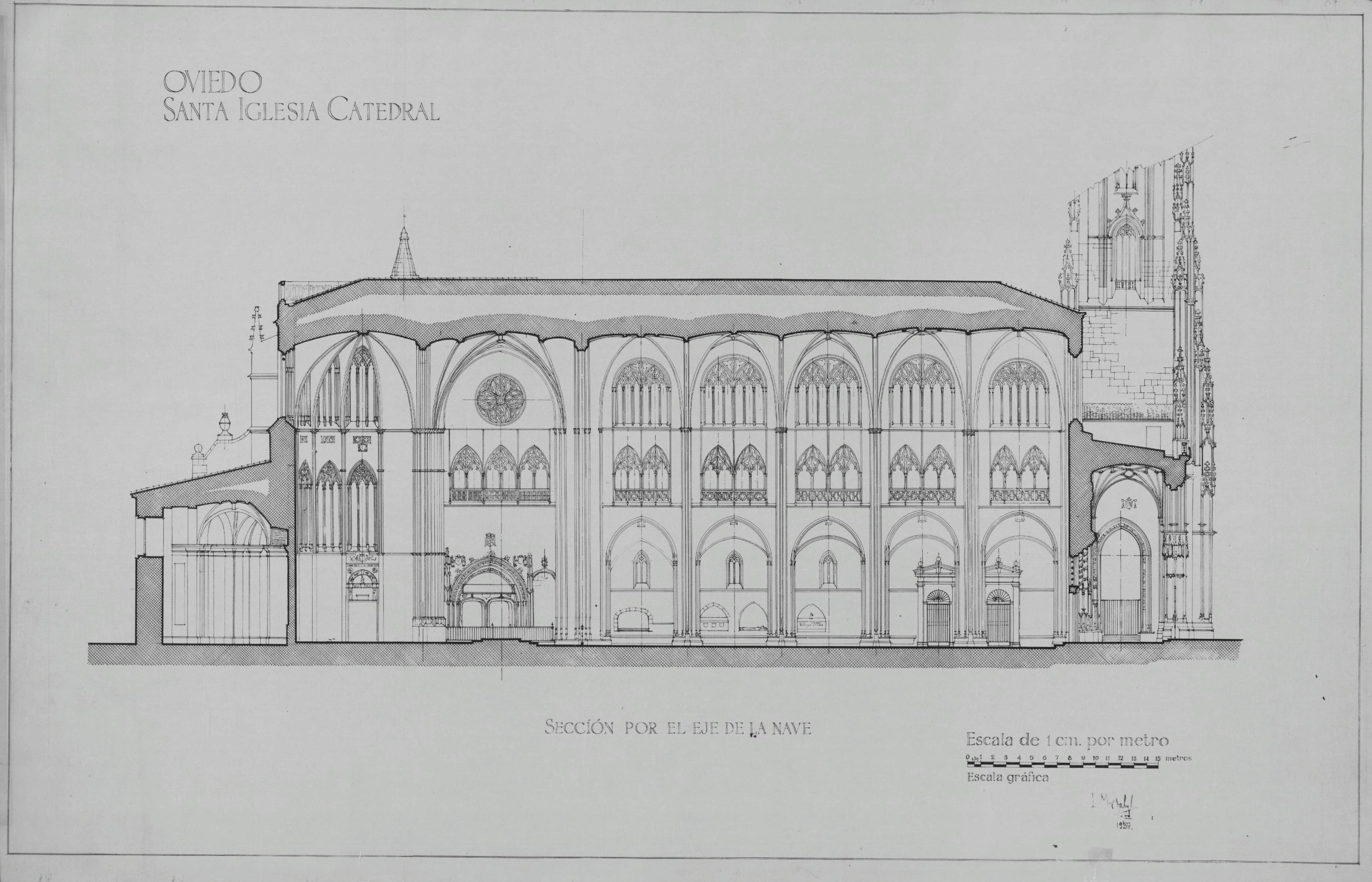 CATEDRAL BASILICA DEL SALVADOR- SANTA IGLESIA CATEDRAL DE OVIEDO: SECCION POR EL EJE DE LA NAVE CON ALZADO DE LA TORRE INTERRUMPIDO, SIN DENOMINACION DE USOS NI COTAS