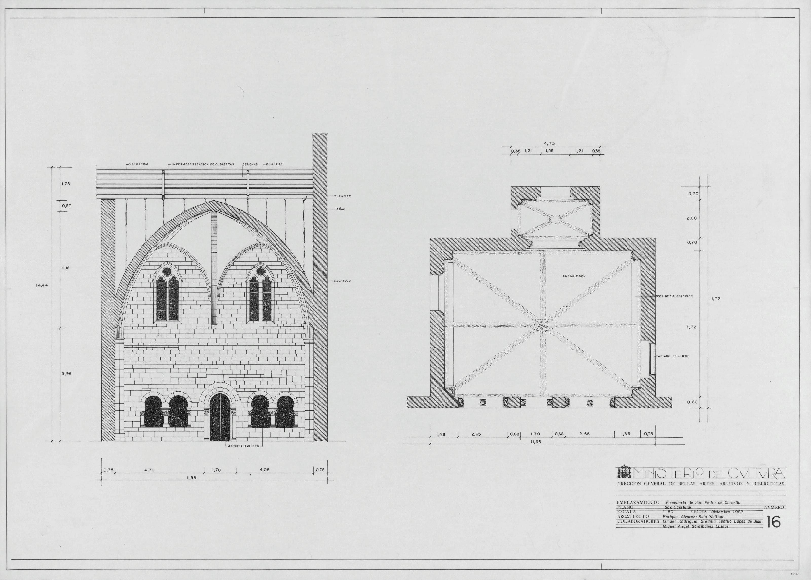 MONASTERIO DE SAN PEDRO DE CARDEÑA.- BURGOS-: SALA CAPITULAR. plano de planta, alzado-seccion acotados y rotulados . Planos realizados por personas contratadas por el INEM.