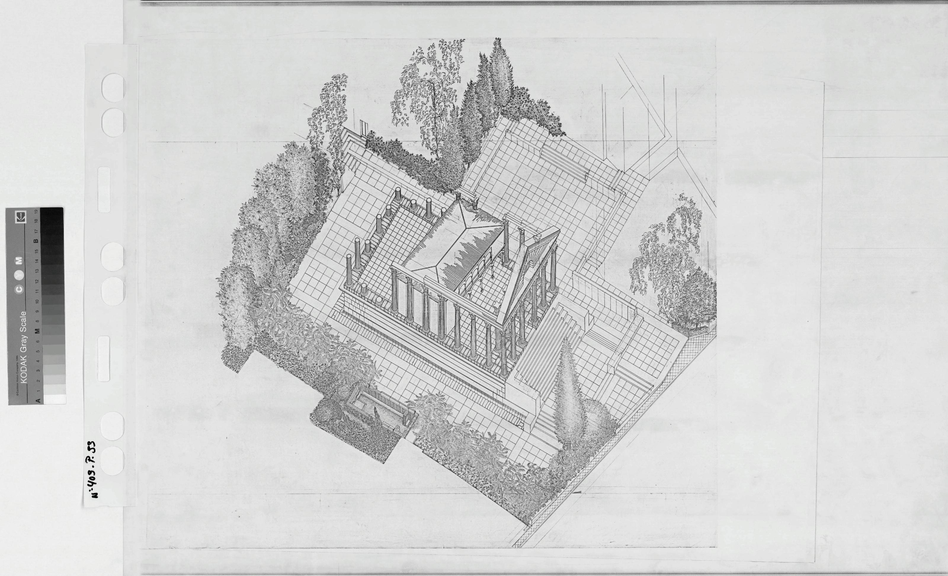 OBRAS DE RESTAURACION EN EL TEMPLO ROMANODE MERIDA (Badajoz): PERSPECTIVA DEL CONJUNTONo parece plano de proyecto, no tiene sello ni recuadroCon despieces de solados y jardinería
