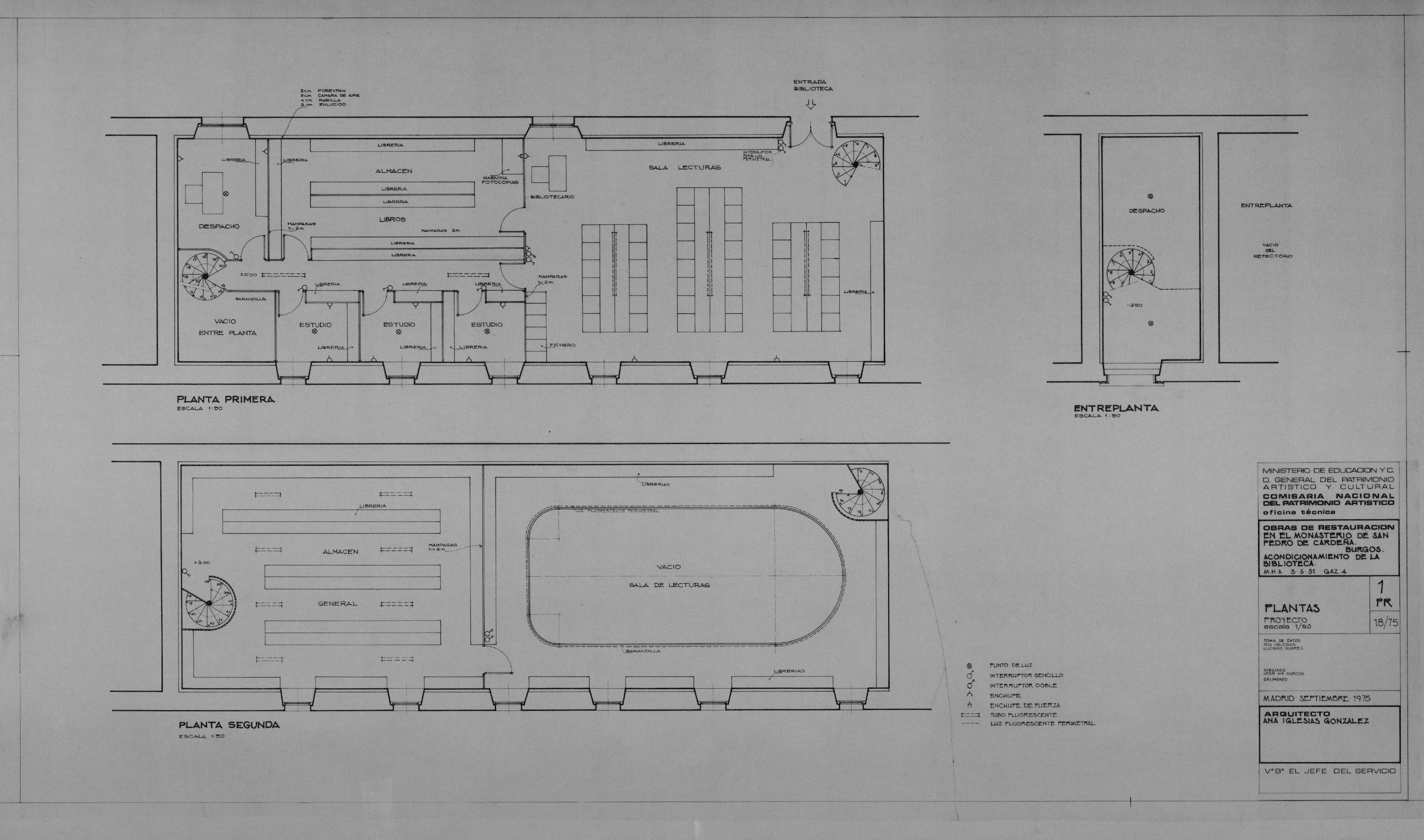 MONASTERIO DE SAN PEDRO DE CARDEÑA. BURGOS- ACONDICIONAMIENTO DE LA BIBLIOTECA.: PLANTAS PROYECTO. Planta primera , planta segunda y entreplanta, este plano es de distribucion, mobiliario y electricidad. Planos realizados por personas contratadas por el IMEN.