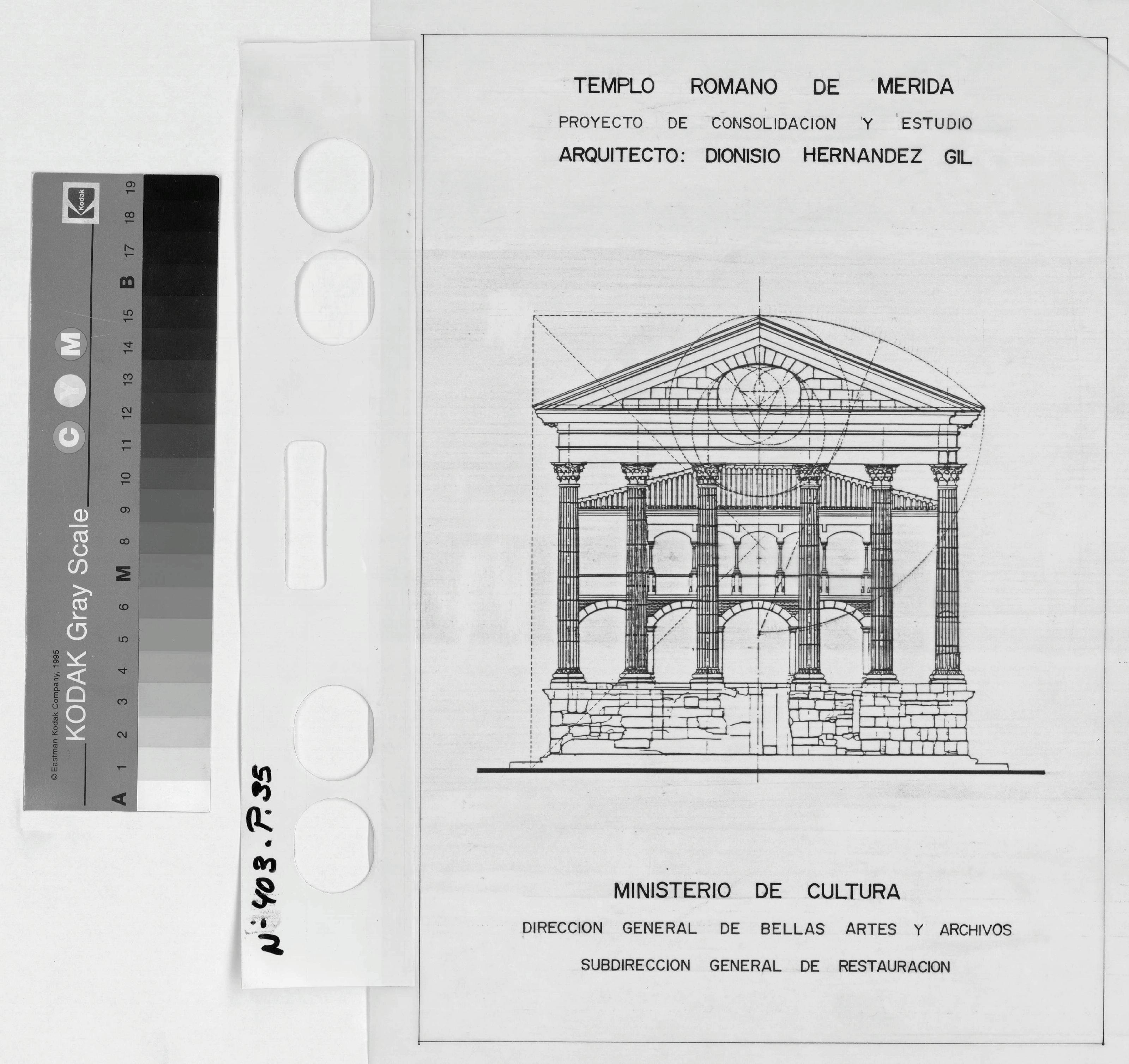 OBRAS DE RESTAURACION EN EL TEMPLO ROMANO DE MERIDA (Badajoz): DIBUJO PARA PORTADA DE PROYECTO Para Proyecto de Consolidación y Estudio del Templo Romano de Mérida Aparece el Alzado principal con el trazado Geométrico
